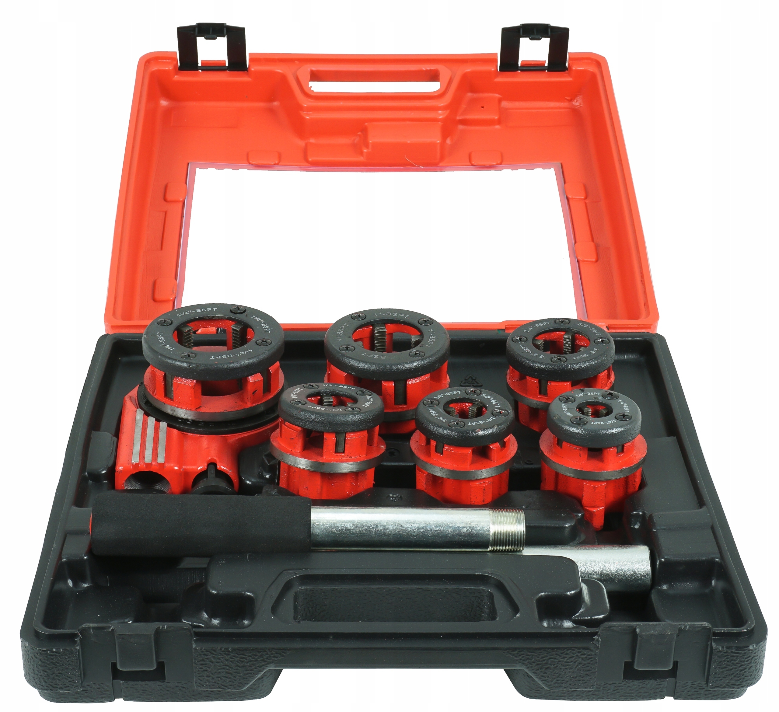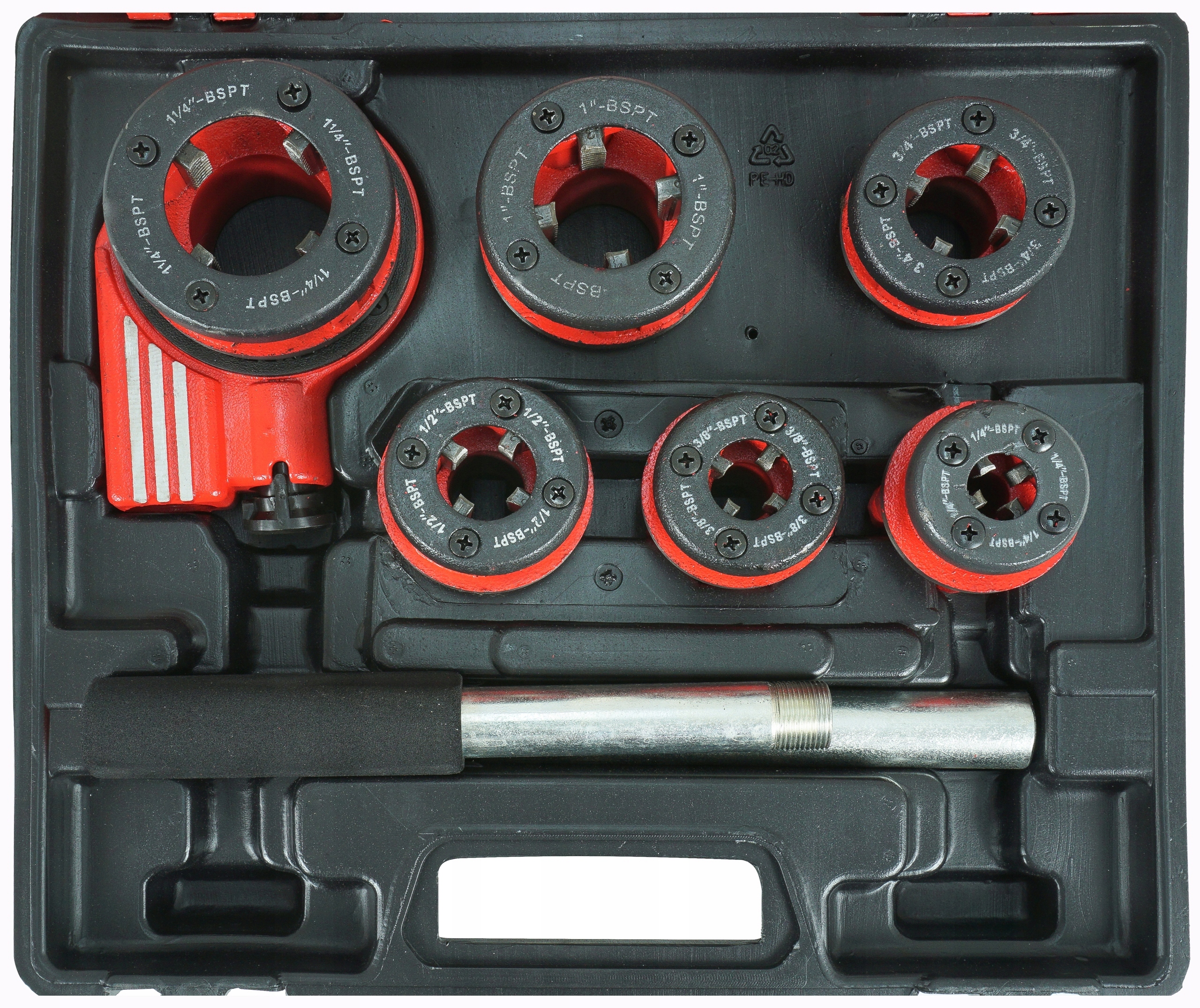 Высококачественный набор для нарезания резьбы на трубах. В комплект входит ручной нитевдеватель с храповым механизмом, значительно облегчающим работу, и переключатель направления работы. В комплект входят 6 сменных насадок разных размеров. Головки изготовлены из очень прочного и прочного материала. Набор упакован в пластиковый чемодан, в котором удобно переносить и хранить все элементы.