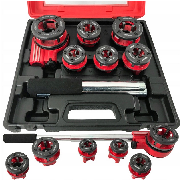 Высококачественный набор для нарезания резьбы на трубах. В комплект входит ручной нитевдеватель с храповым механизмом, значительно облегчающим работу, и переключатель направления работы. В комплект входят 6 сменных насадок разных размеров. Головки изготовлены из очень прочного и прочного материала. Набор упакован в пластиковый чемодан, в котором удобно переносить и хранить все элементы.