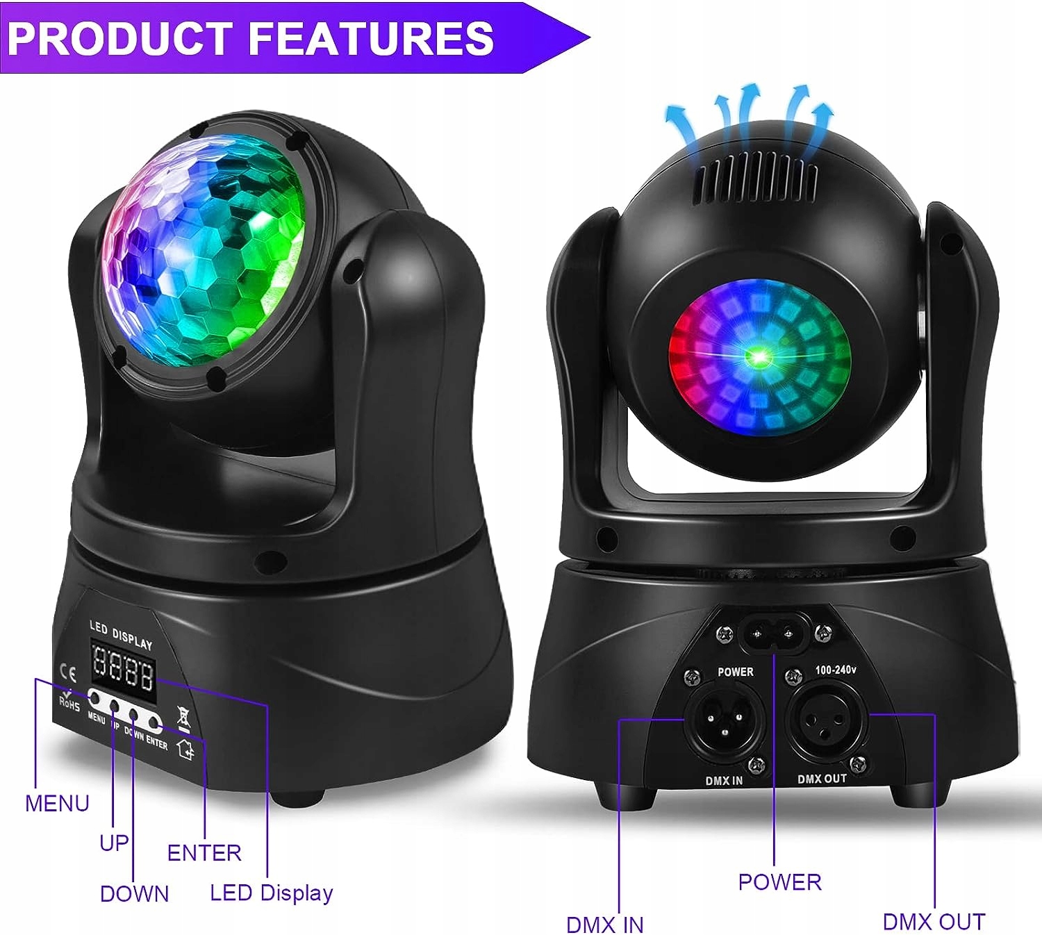 ☀ 4 режима управления освещением DJ. Движущимися огнями можно управлять автоматически, по звуку, по DMX или по принципу «главный-подчиненный». Канала DMX 15. С его помощью можно менять звук включения, цвет, затемнение, стробоскоп. Эффектов можно легко добиться, нажав функцию