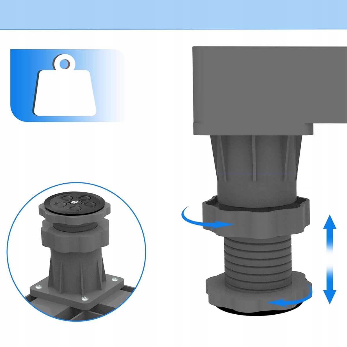 Телескопическое выдвижное основание подходит для стиральной машины, сушильной машины и холодильника. 8 встроенных синих уровней обеспечивают равномерное расположение всех 4 ножек.