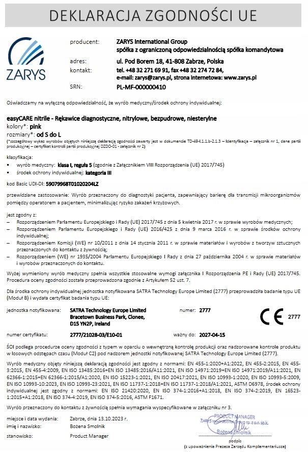 - соответствие техническим стандартам: EN 455 -1:2020, EN 455-2:2015, EN 455-3:2015, EN 455-4:2009, EN ISO 13485:2016+EN ISO 13485:2016/A11:2021, EN ISO 14971:2019+EN ISO 14971:2019/A11:2021, EN 62366-1:2015+EN 62366-1:2015/A1:2020, EN ISO 15223-1:2021, EN ISO 20417:2021, EN ISO 10993-1:2020, EN ISO 10993-5:2009, EN ISO 10993-10:2013, EN ISO 11737-1:2018, EN 420:2003+A1:2009, EN ISO 374-1:2016+A1:2018, EN 374-2:2014, EN 16523-1:2015 +A1:2018, EN 374-4:2013, EN ISO 374-5:2016, ASTM D6978, ASTM F1671, ASTM D6319