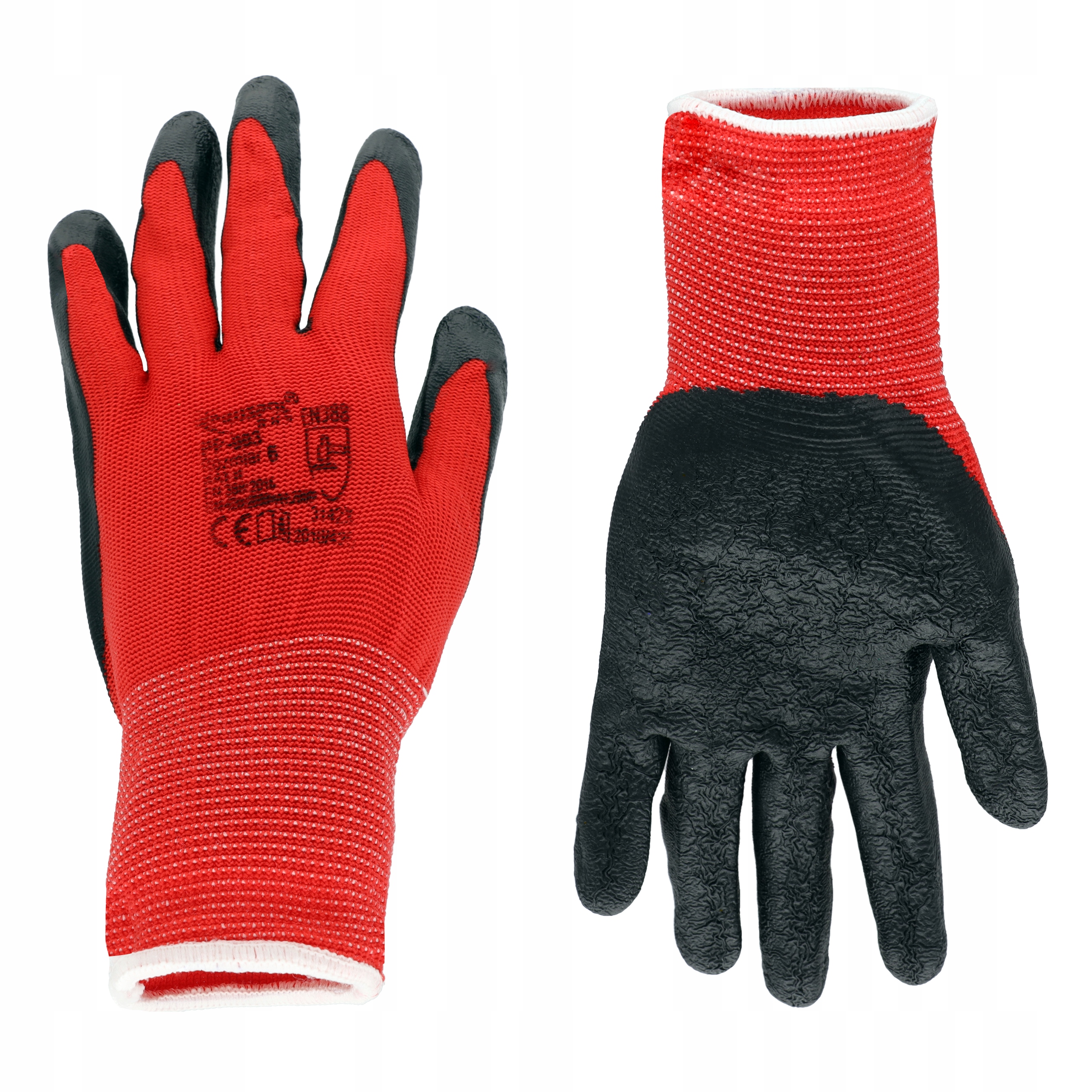 Перчатки рабочие защитные трикотажные красные, с черным латексным покрытием на рукоятке.