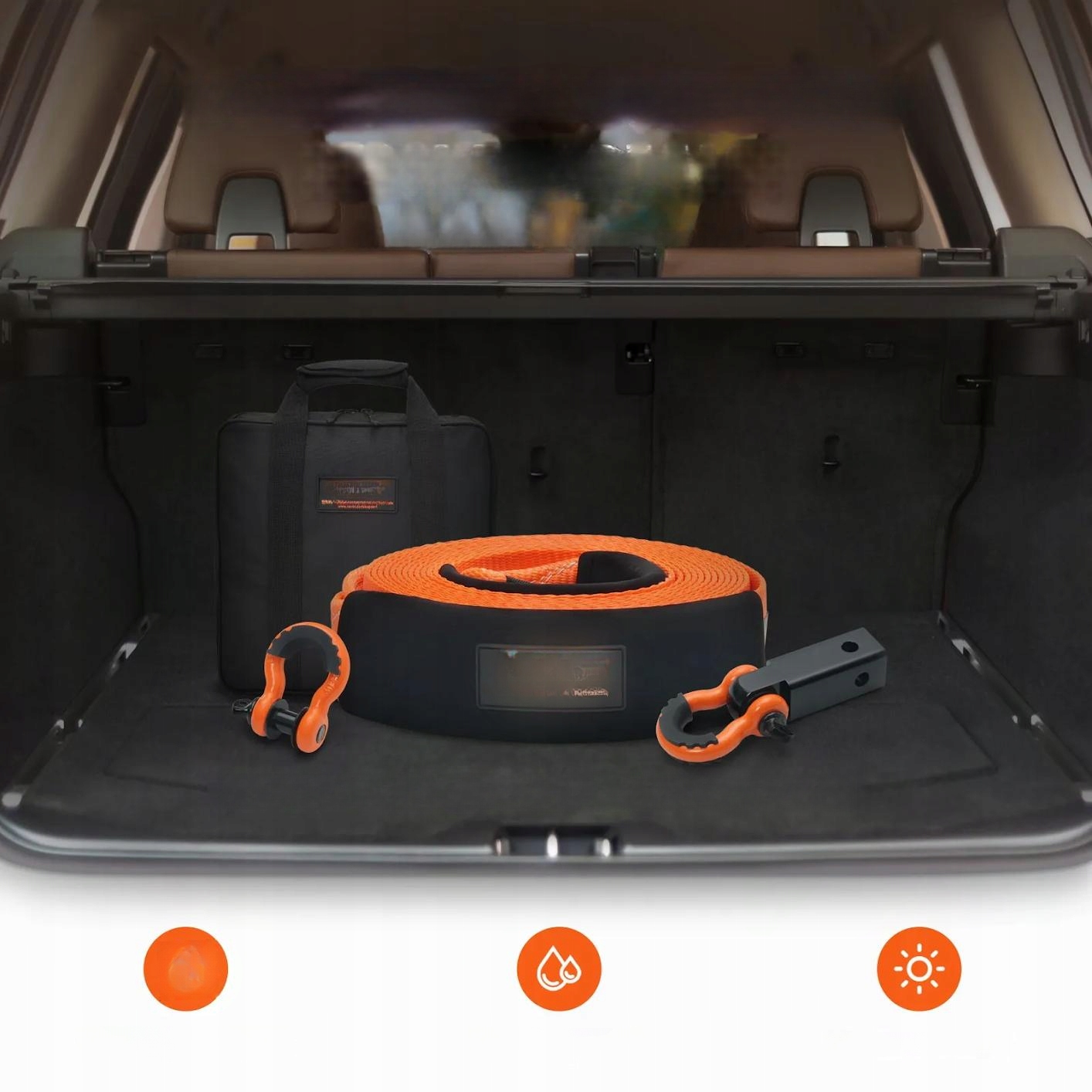 Буксирный ремень подходит для различных сценариев спасения, включая буксирующие транспортные средства, застрявшие в грязи, песке или траве. Его также можно использовать для защиты транспортного средства, прикрепляя его к дереву, что делает его незаменимым элементом оборудования каждого водителя.