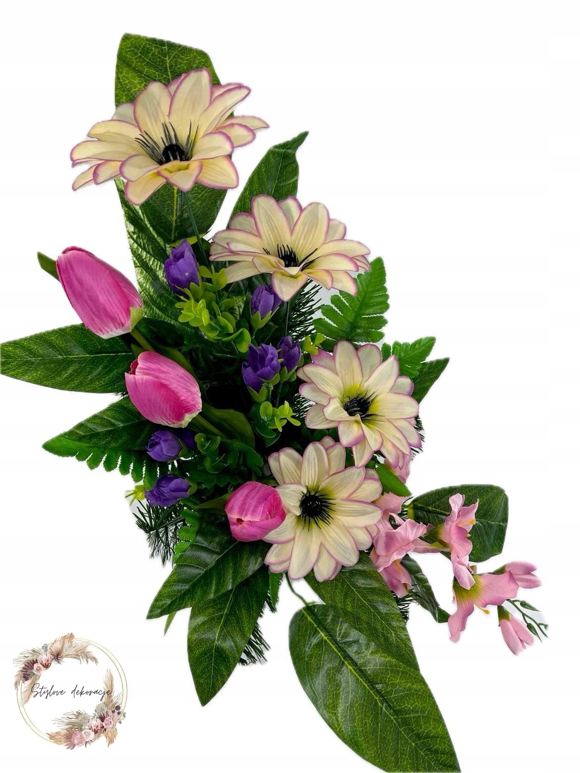 - искусственные цветы в кремово-розовый с насыщенно-зелеными растениями,