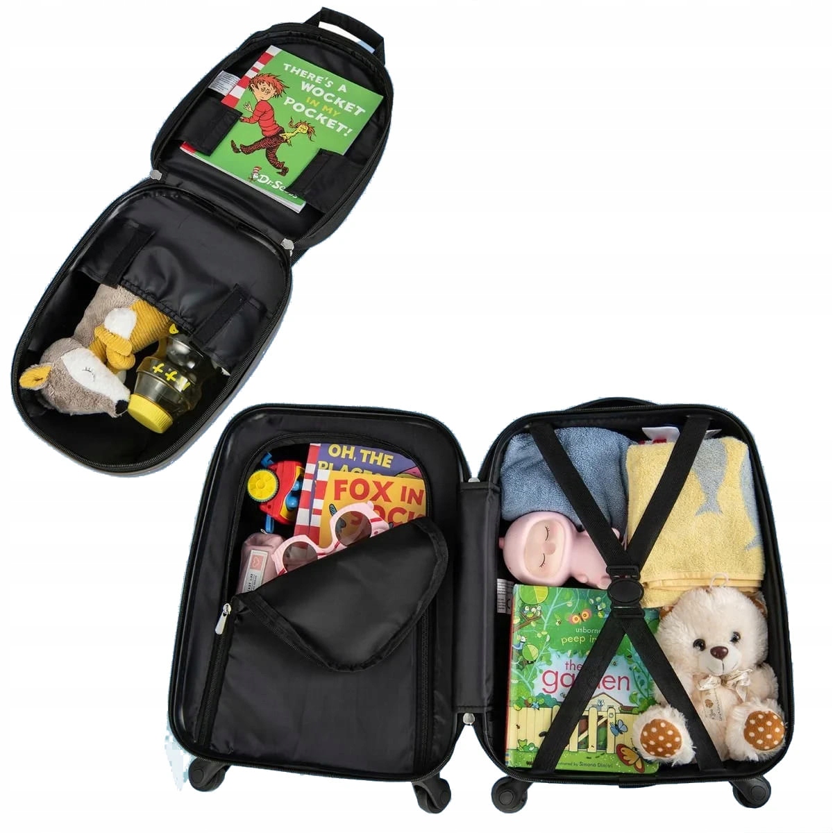 Большая вместимость и место для хранения: Чемодан и рюкзак имеют несколько отделений, в которых достаточно места для хранения игрушек, одежды, закусок, книг, туалетных принадлежностей и многого другого.