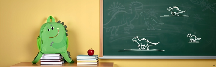 зеленый цвет и забавный рисунок с динозавром с выпуклыми элементами (например, шипы и хвост) заставляют маленьких влюбляться с ним с первого взгляда. Карманы - идеально подходит для бутылки с водой или безделушек.