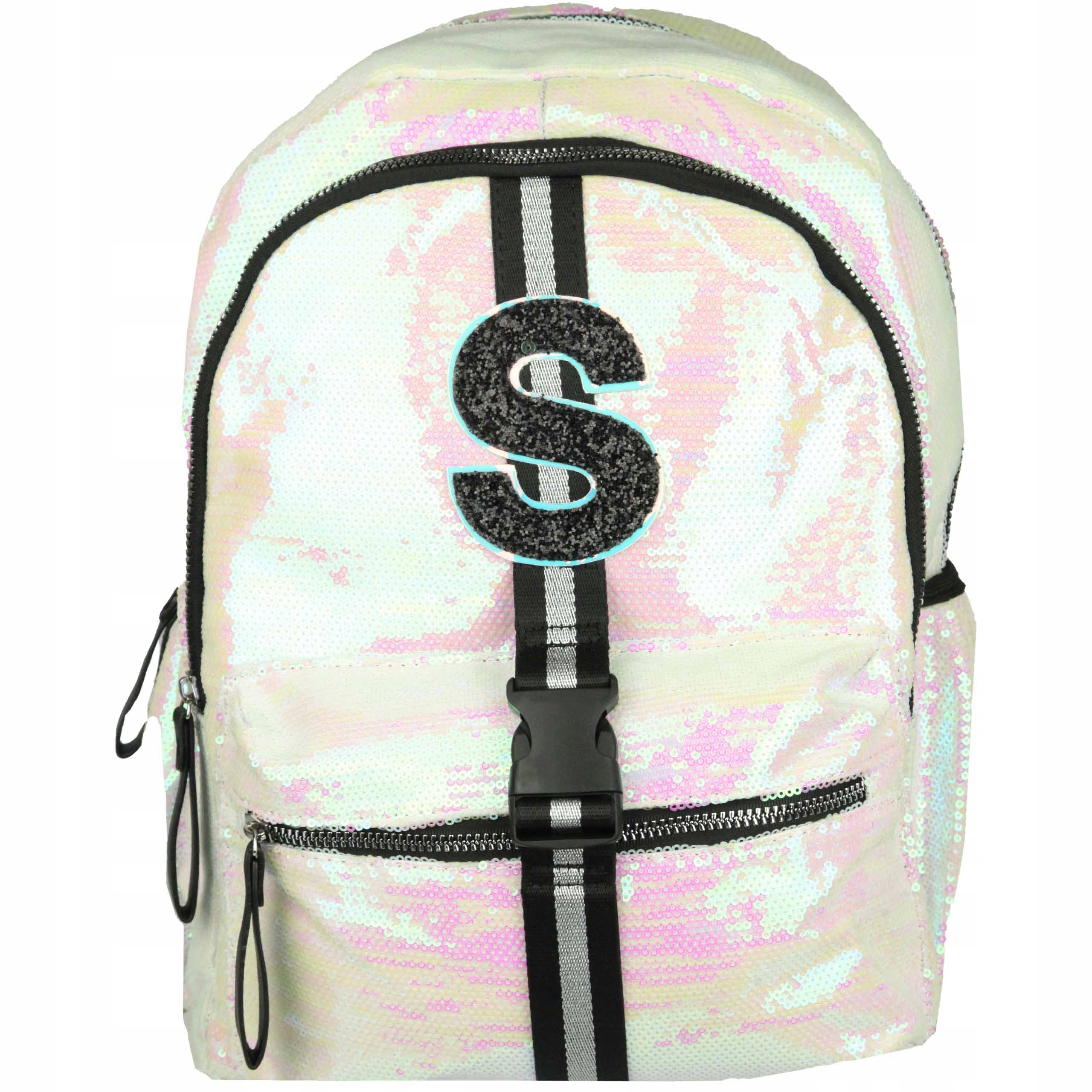 Красиво сделано. Рюкзак покрыт красиво сверкающими пайетками. Задняя часть рюкзака слегка усилена. Спереди декоративная буква S и застежка-кнопка. Широкие, удобные, регулируемые бретели. Два отделения, одно из которых имеет карман поменьше. В передней части рюкзака есть карман для перекусов и два по бокам, которые отлично подойдут для напитков. Рюкзак на молнии.