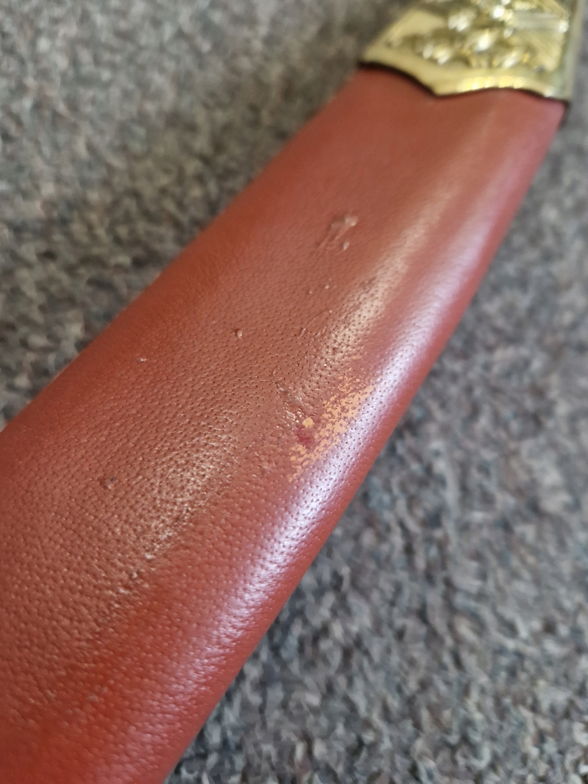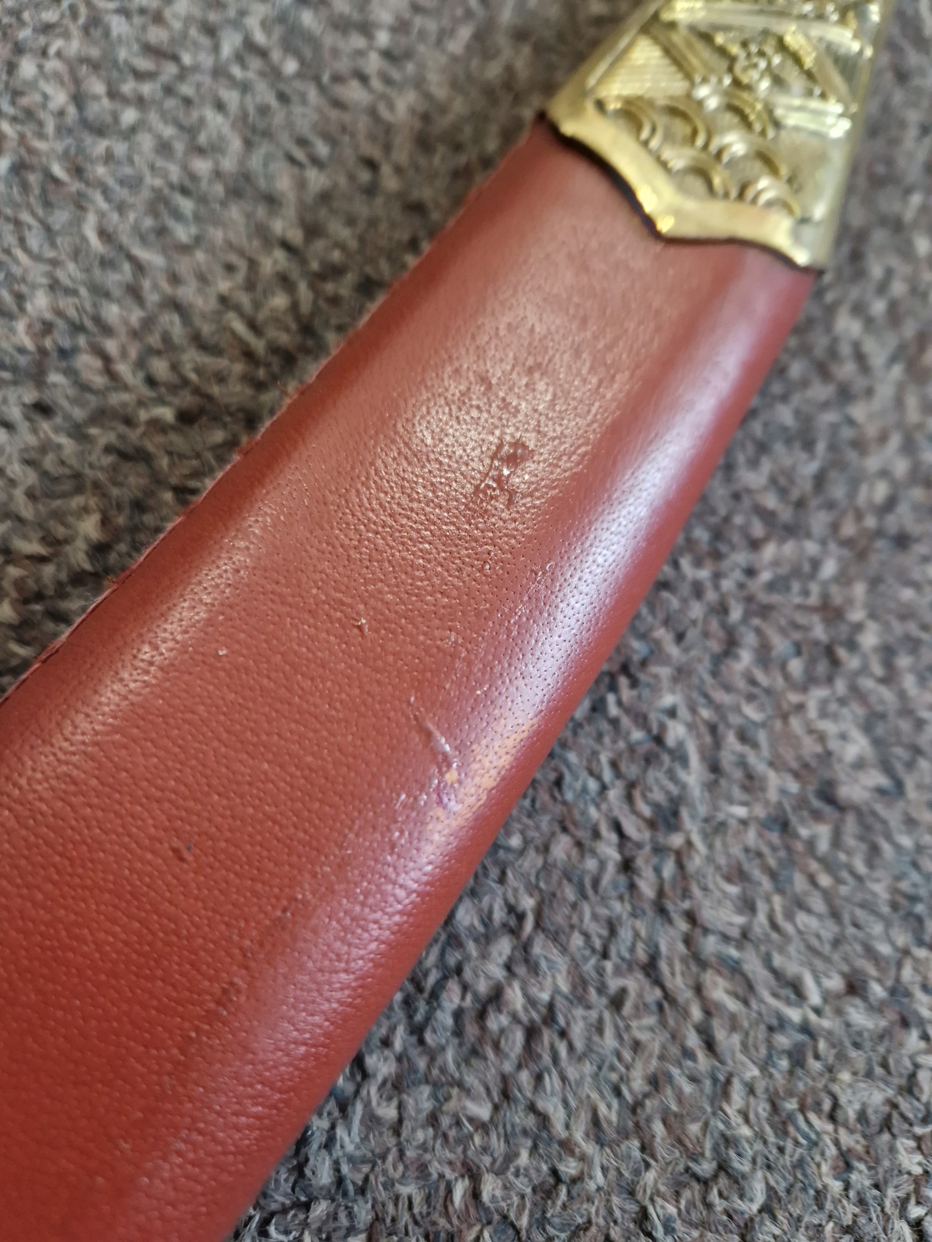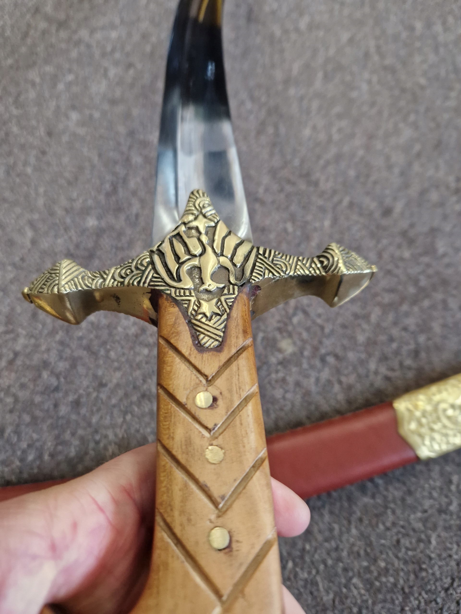 Характерная деревянная ручка в форме головы орла была укреплена заклепками. Jelec без лука, сделанный из латуни и украшенный восточным образом с орлом посередине и изображением Марии, матери Божьей.