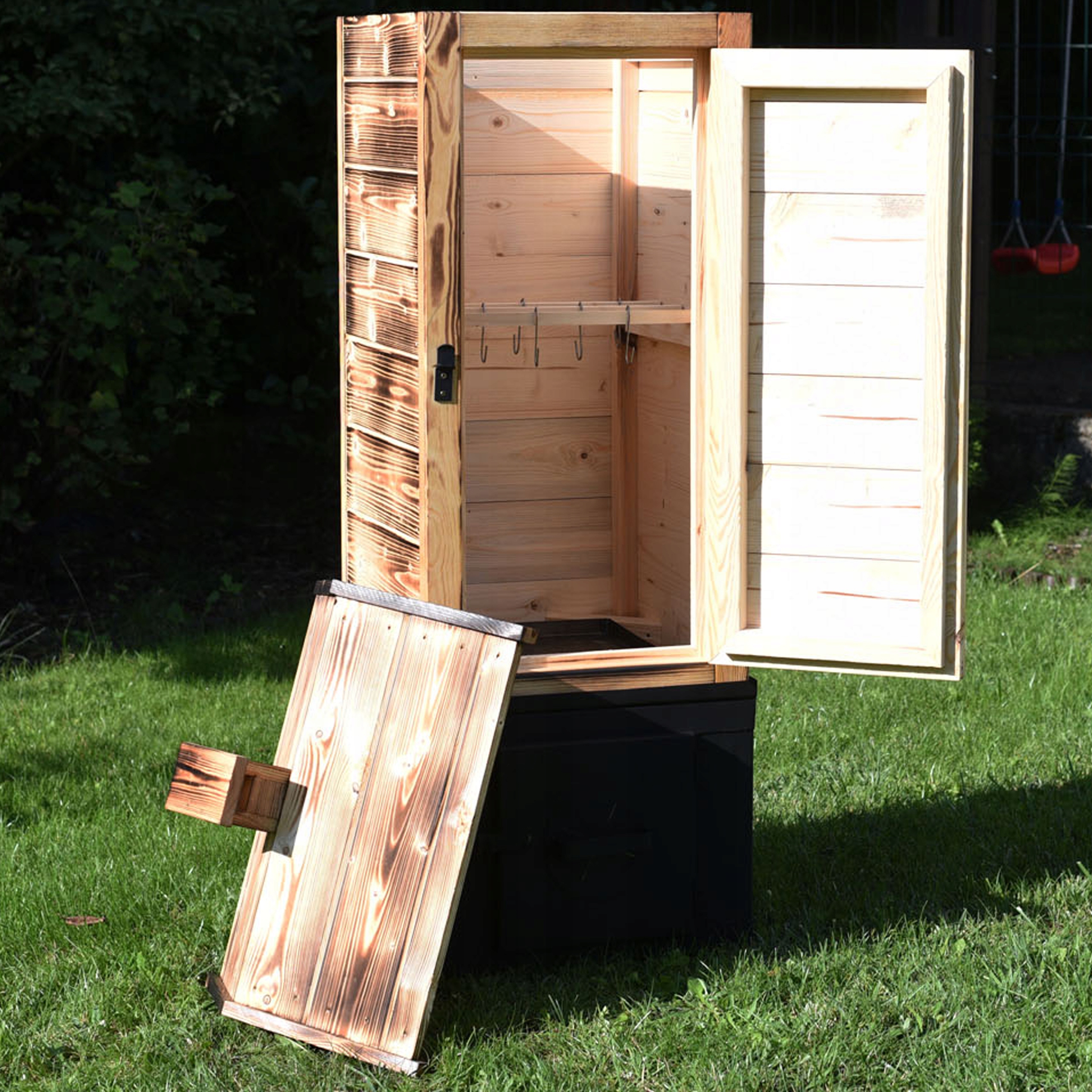 - Все элементы после копчения помещаются в деревянную коптильную камеру. Это обеспечивает мобильность коптильни.