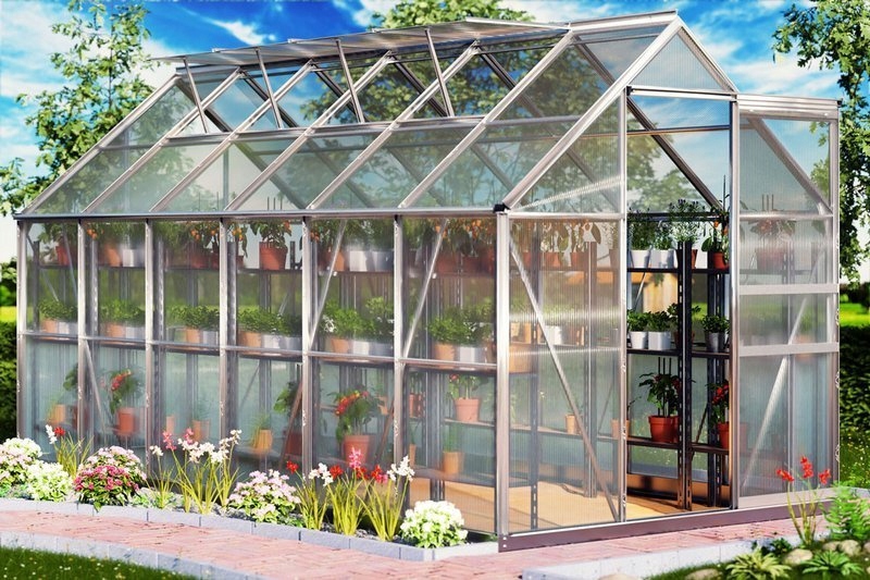 Алюминиевая теплица с входной дверью из алюминиевых профилей. Практическое окно крыши обеспечивает правильную циркуляцию воздуха.