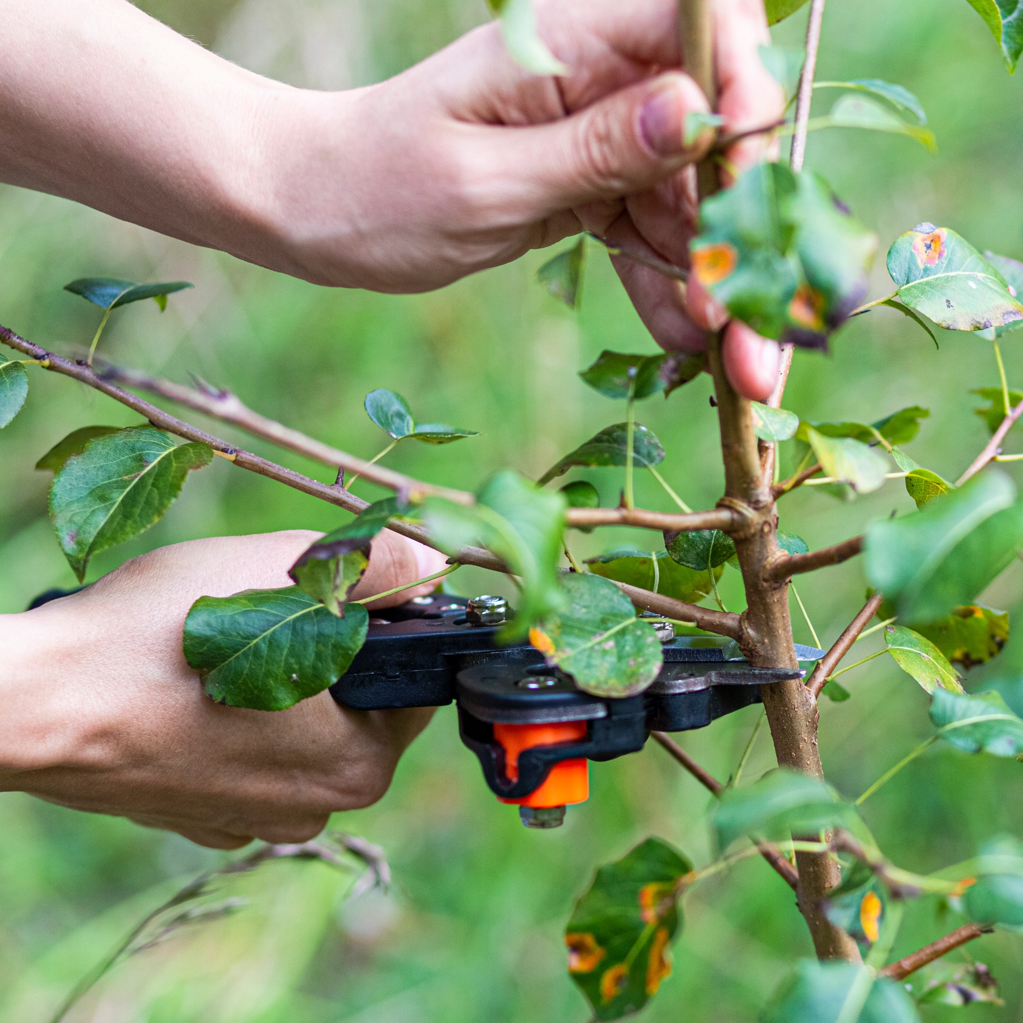 Секатор обеспечивает максимальный эффект, позволяя провести быструю, точную и эффективную имплантацию даже начинающим садоводам и плодоводам. Прочная стальная конструкция в корпусе из прочного пластика сочетает в себе функциональность и современный дизайн. Инструмент оснащен эргономичными ручками и замком, что обеспечивает соответствующий комфорт использования. Помимо ленты и секатора в комплект также входят три сменные стальные прививочные вставки разной формы (одна уже установлена), а также запасная шайба. Каждую вставку можно использовать с обеих сторон, получая новые, неиспользованные лезвия. Зубчатый профиль секатора облегчает обрезку ненужных ветвей, затрудняющих прививку.