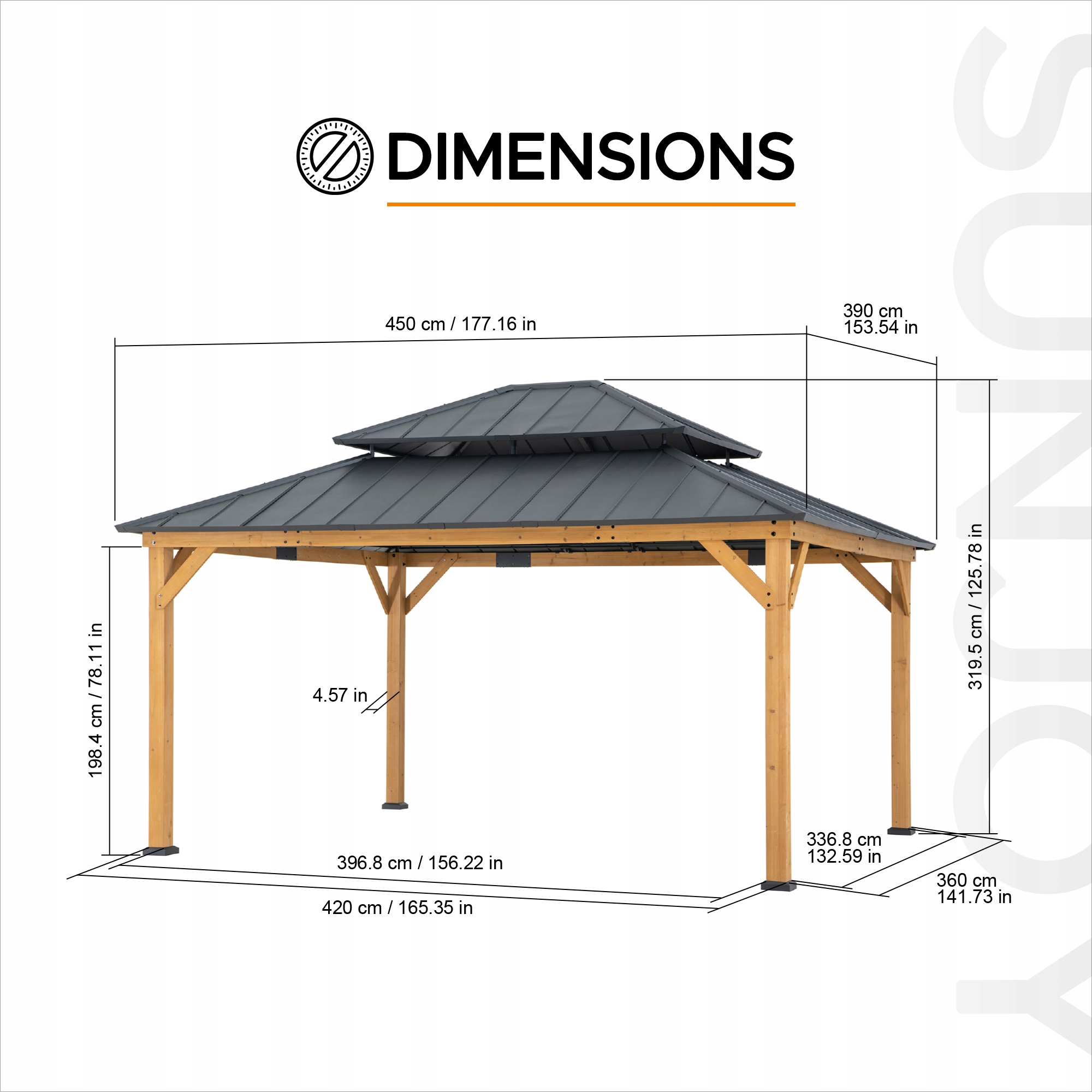 Расширьте свое жилое пространство, включив внутреннее пространство, и создайте оазис в конце дня, который станет идеальным местом для развлечения семьи и друзей. Эта беседка размером 390x450 см от ведущего мирового производителя готовых к сборке уличных конструкций Sunjoy создает идеальную обстановку для встреч на открытом воздухе в любое время года. Проведите все четыре сезона, наслаждаясь крытой открытой площадкой под беседкой с кедровым каркасом и прочной стальной крышей с порошковым покрытием, которая выдержит испытание временем. Двухуровневая крыша обеспечивает необходимый поток воздуха, защищая от случайных ненастных погодных условий. Создайте настроение, повесив люстру на встроенный потолочный крючок, чтобы обеспечить функциональное освещение и элегантный дизайн. Благодаря простым и понятным инструкциям по сборке вы скоро сможете долгие годы отдыхать в своем любимом новом жилом пространстве на открытом воздухе.