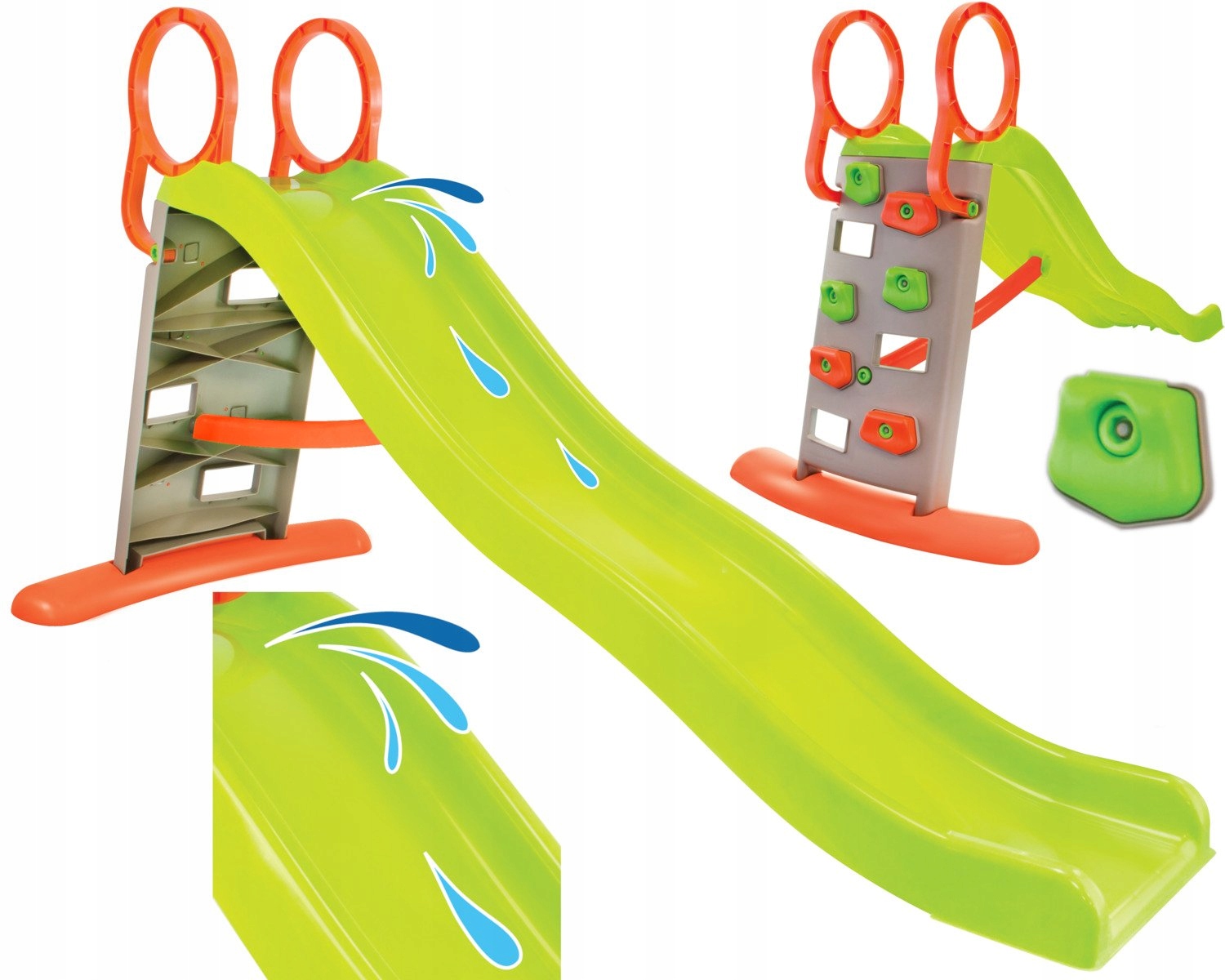 Горка с эргономичными ручками, стенка для лазанья, устойчивая пластиковая конструкция, возможность подключения садового шланга для опрыскивания горки, разборная.