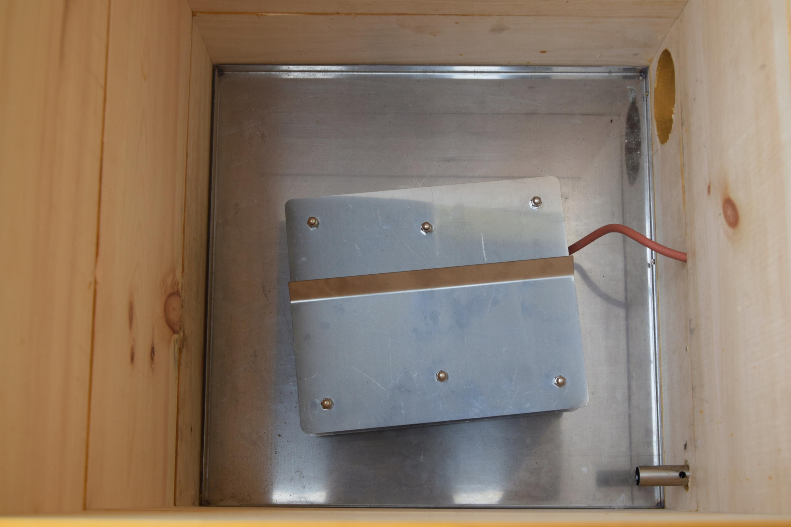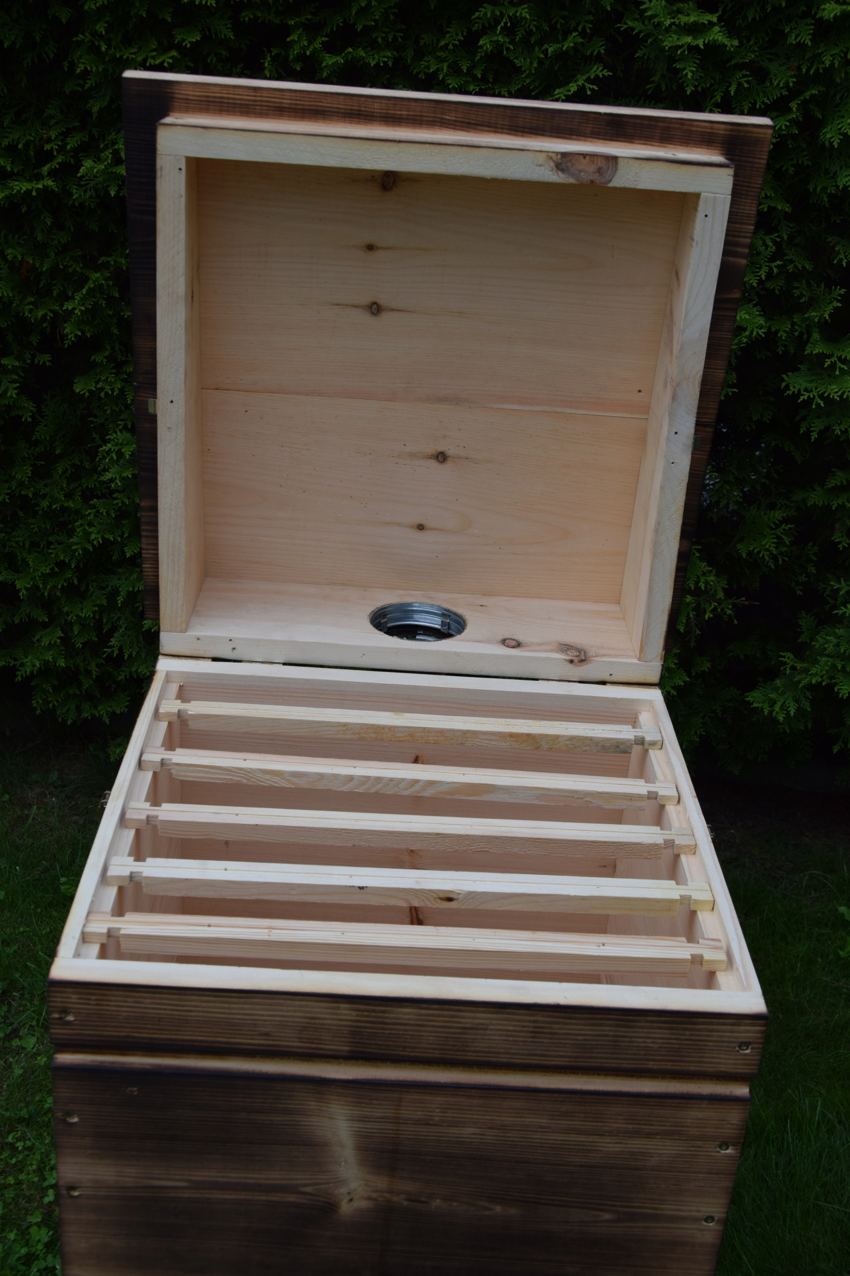 Крыша крепится на петлях, что позволяет удобно просматривать копчености, и имеет внешние размеры 58х58 см, что в значительной степени защищает от стекания воды по стенам.