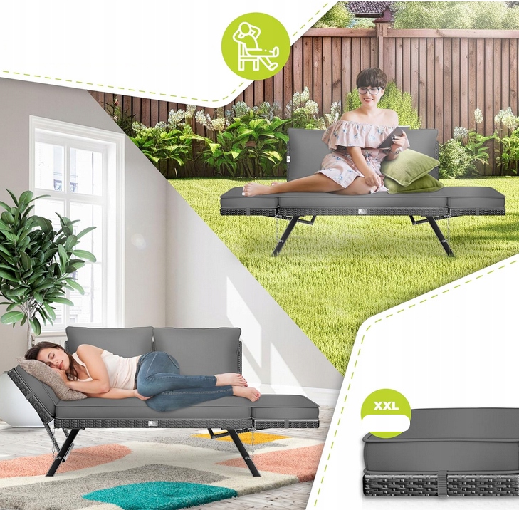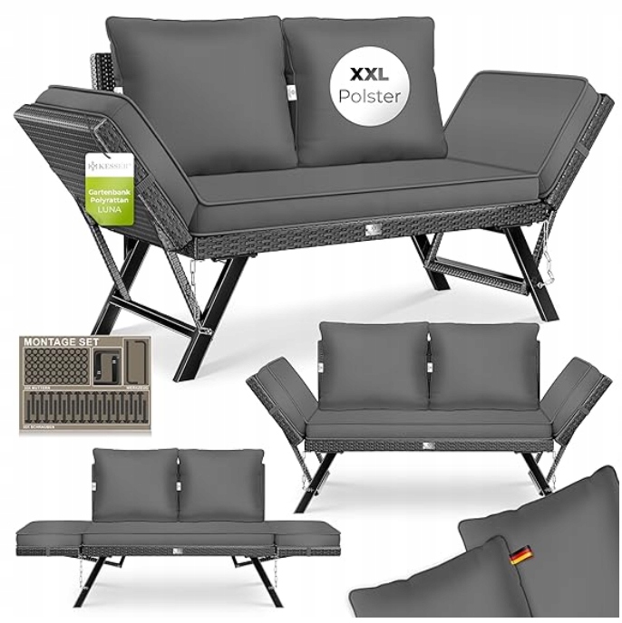 Откройте для себя многофункциональную садовую скамейку Luna, которая сочетает в себе элегантность, высочайший комфорт и солидное качество изготовления. Благодаря продуманной конструкции всего за несколько минут вы сможете превратить его из удобной скамейки в роскошный шезлонг, идеально подходящий для отдыха на природе. Это идеальное решение для вашего сада, террасы или патио.