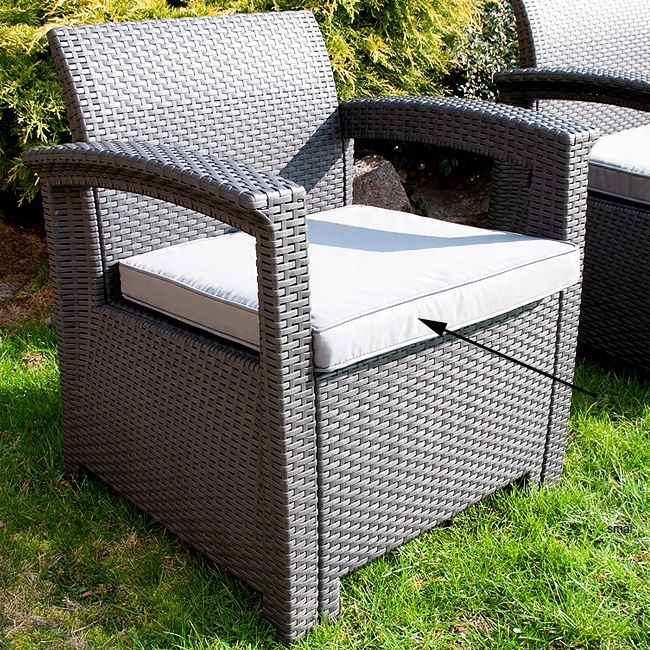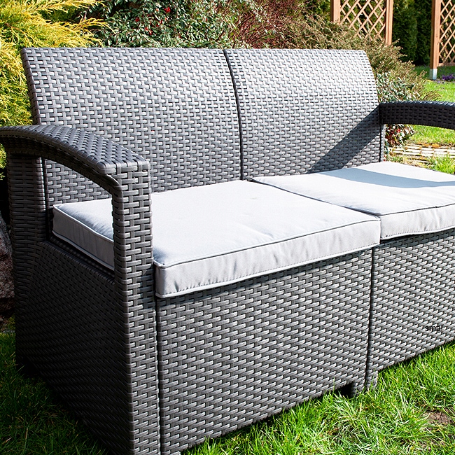 Комплект мебели MADRID предназначен для отдыха четырех человек. В комплект входит двухместный диван, два удобных кресла и журнальный столик. Диван и кресла имеют удобные и толстые подушки, которые обеспечивают максимальный комфорт при сидении. Плотные подушки оснащены застежкой-молнией, благодаря чему материал легко чистится.