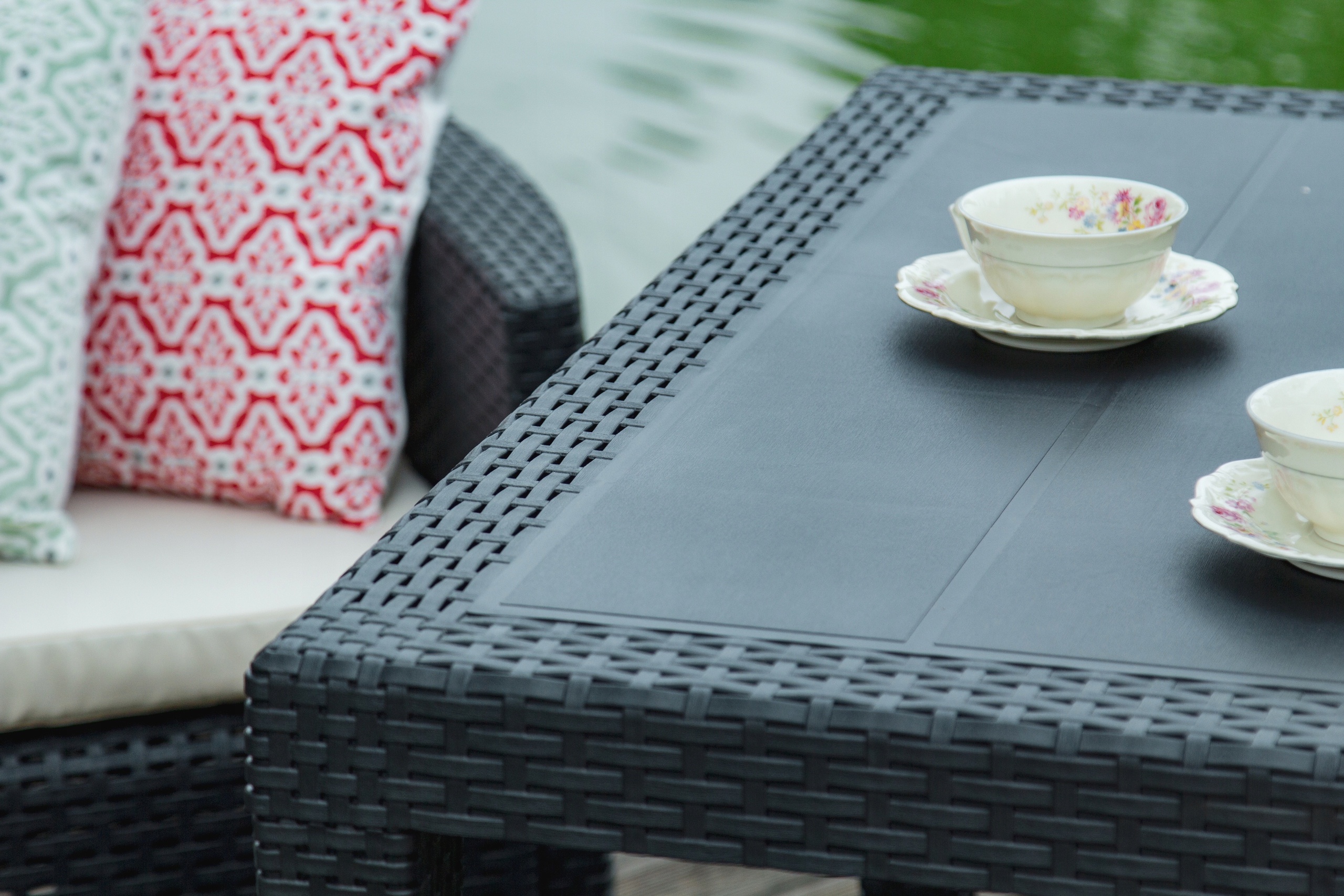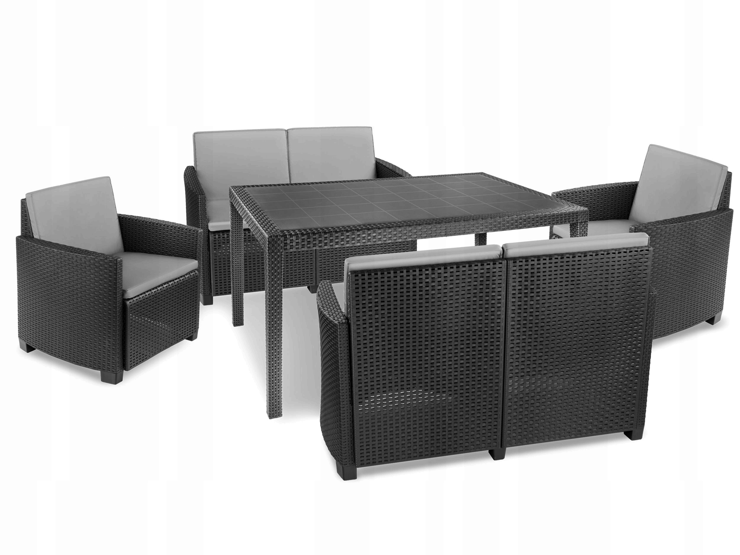 Чтобы сохранить безупречную долговечность материалов, мебель следует размещать под крышей. Графитовый комплект доступен со светло-серыми подушками. Материал подушки легко чистится и устойчив к влаге при правильной пропитке.
