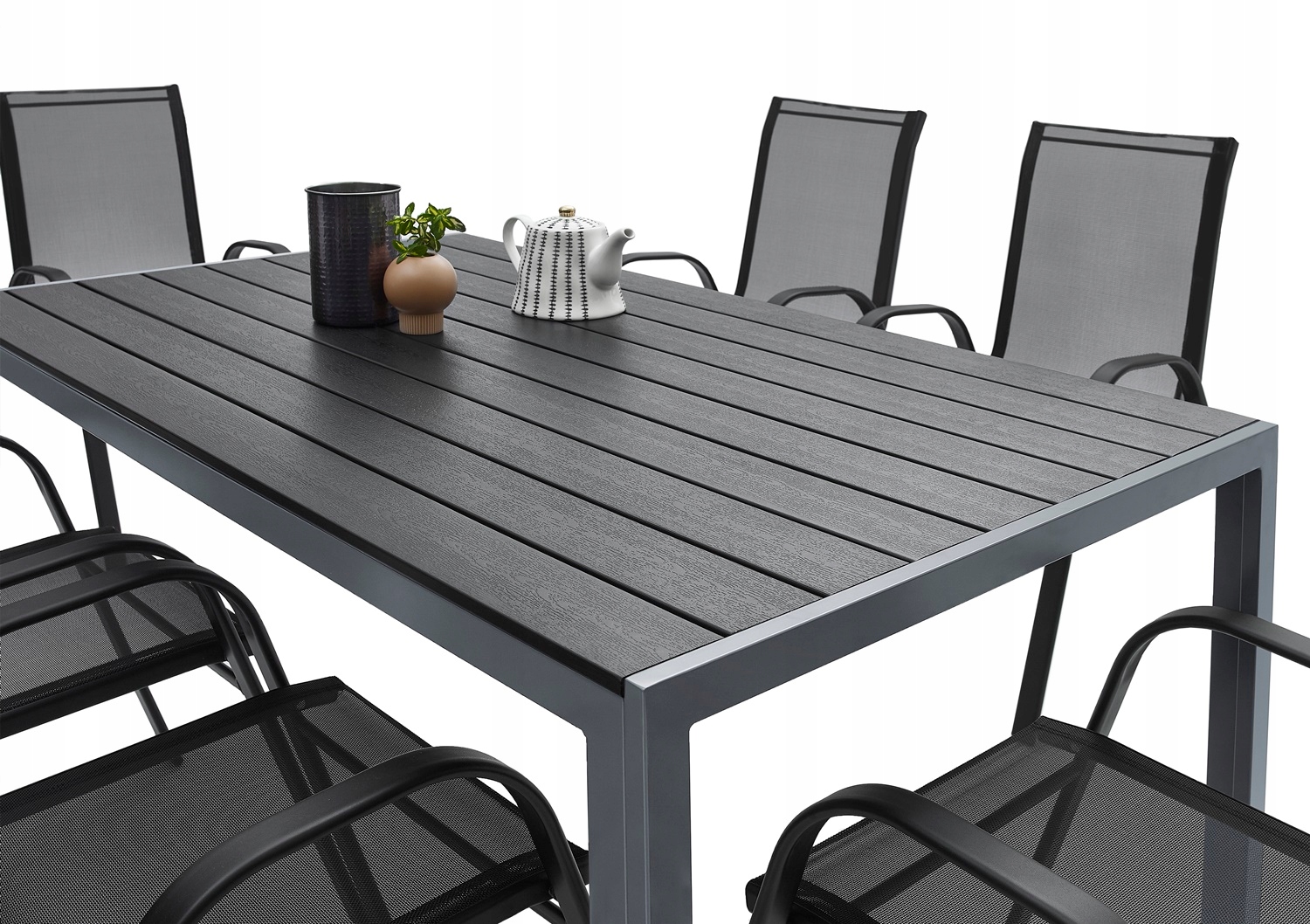 Стол изготовлен из высококачественного алюминия с порошковым покрытием. Столешница в предлагаемом комплекте изготовлена из водопоглощающих композитных плит ДПК, используемых, в том числе, для производства современных террасных и фасадных систем. Важнейшим конструктивным элементом стола являются 4 алюминиевых профиля П-образной формы. Их использование делает стол чрезвычайно устойчивым после сборки! Такое решение позволило освободить пространство под столом и избежать ненужных дополнительных конструкций, мешающих комфортному использованию мебели.