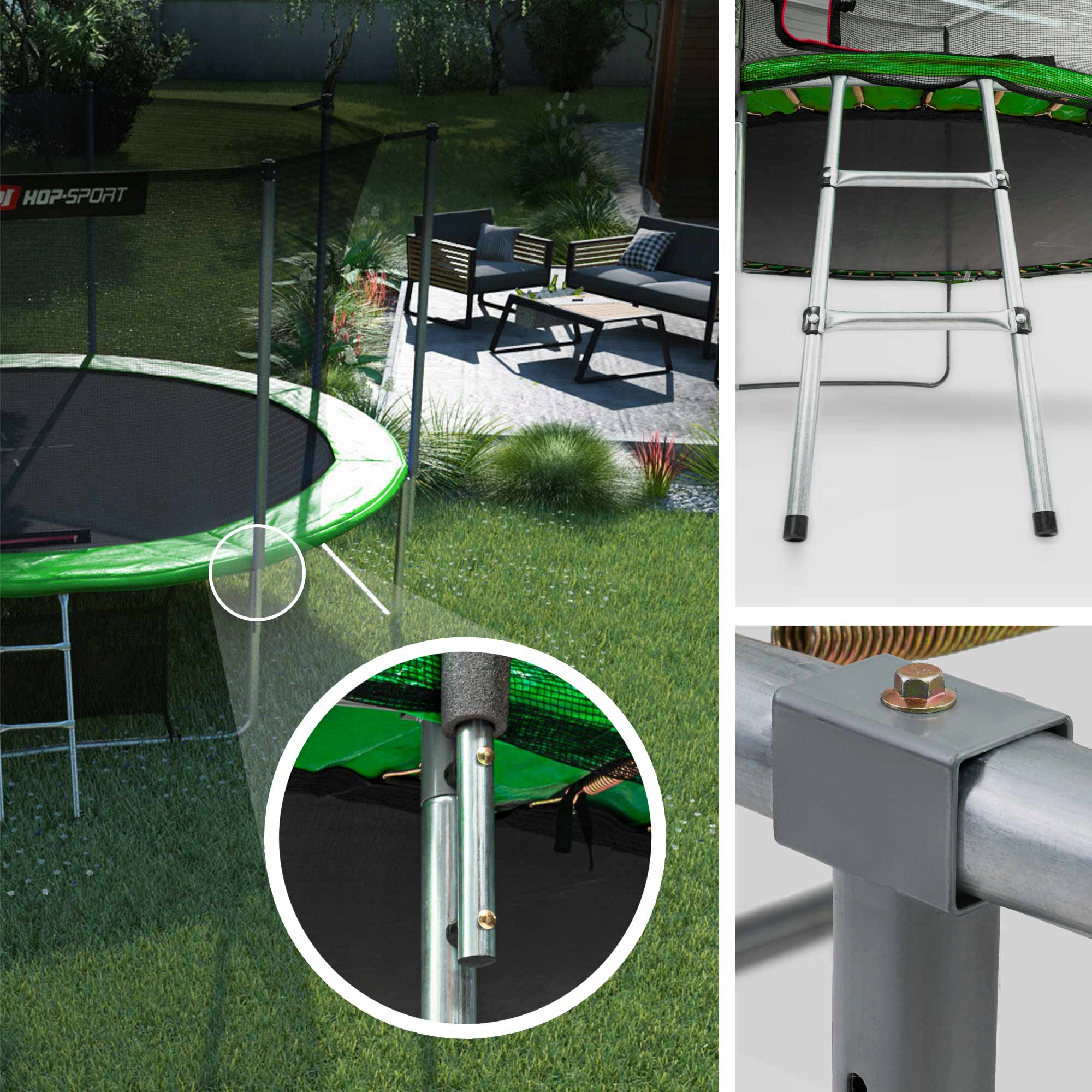 Все элементы конструкции садового батута Hop-Sport изготовлены из высококачественной закаленной, оцинкованной и оцинкованной стали, что обеспечивает долговечность батутов на протяжении многих сезонов и эффективную защиту конструкции от коррозии и разрушения. Отдельные элементы соединяются друг с другом с помощью длинных винтов. Каркас батута состоит из 4 двойных П-образных ножек. Они изготовлены из высококачественной стали. Их задача — стабилизировать всю конструкцию и обеспечить безопасность даже во время очень интенсивных игр/прыжков.