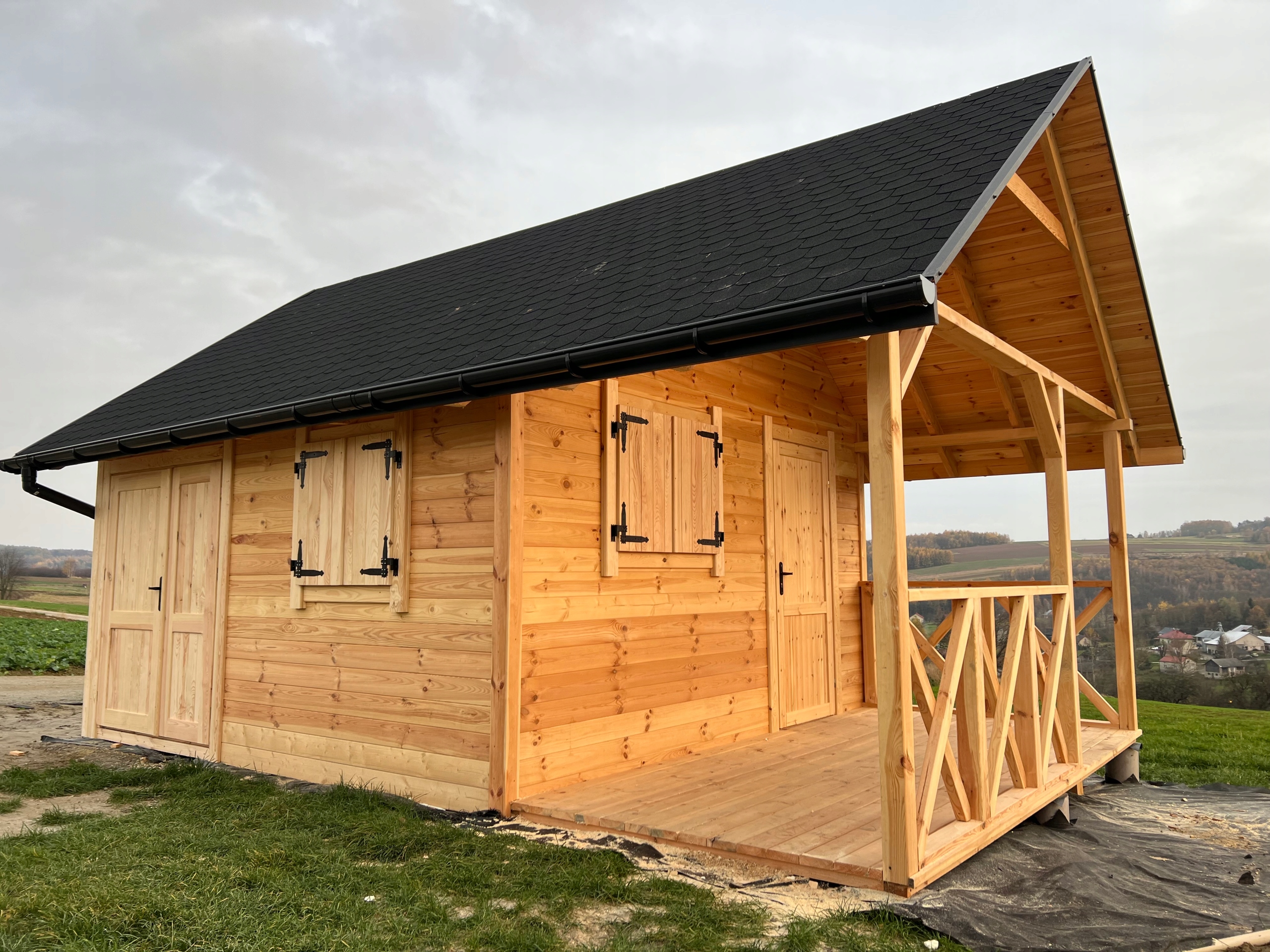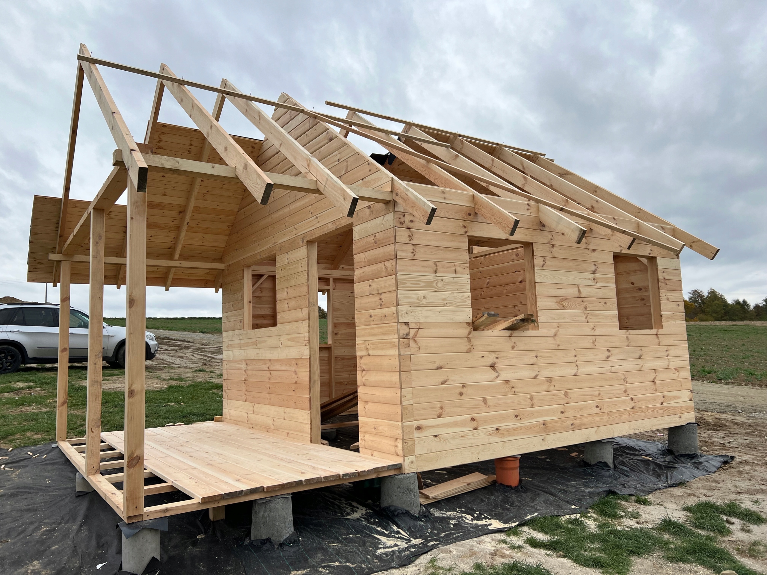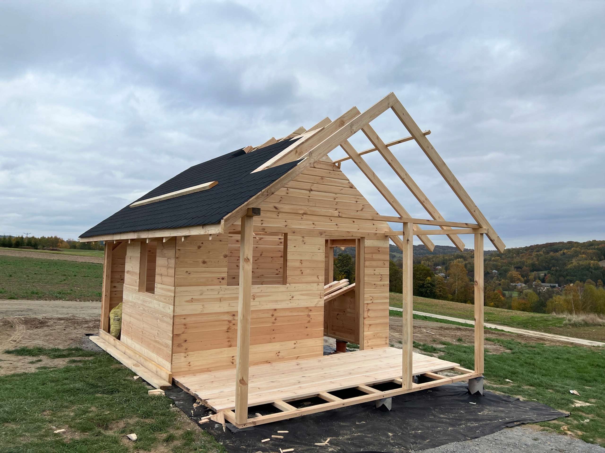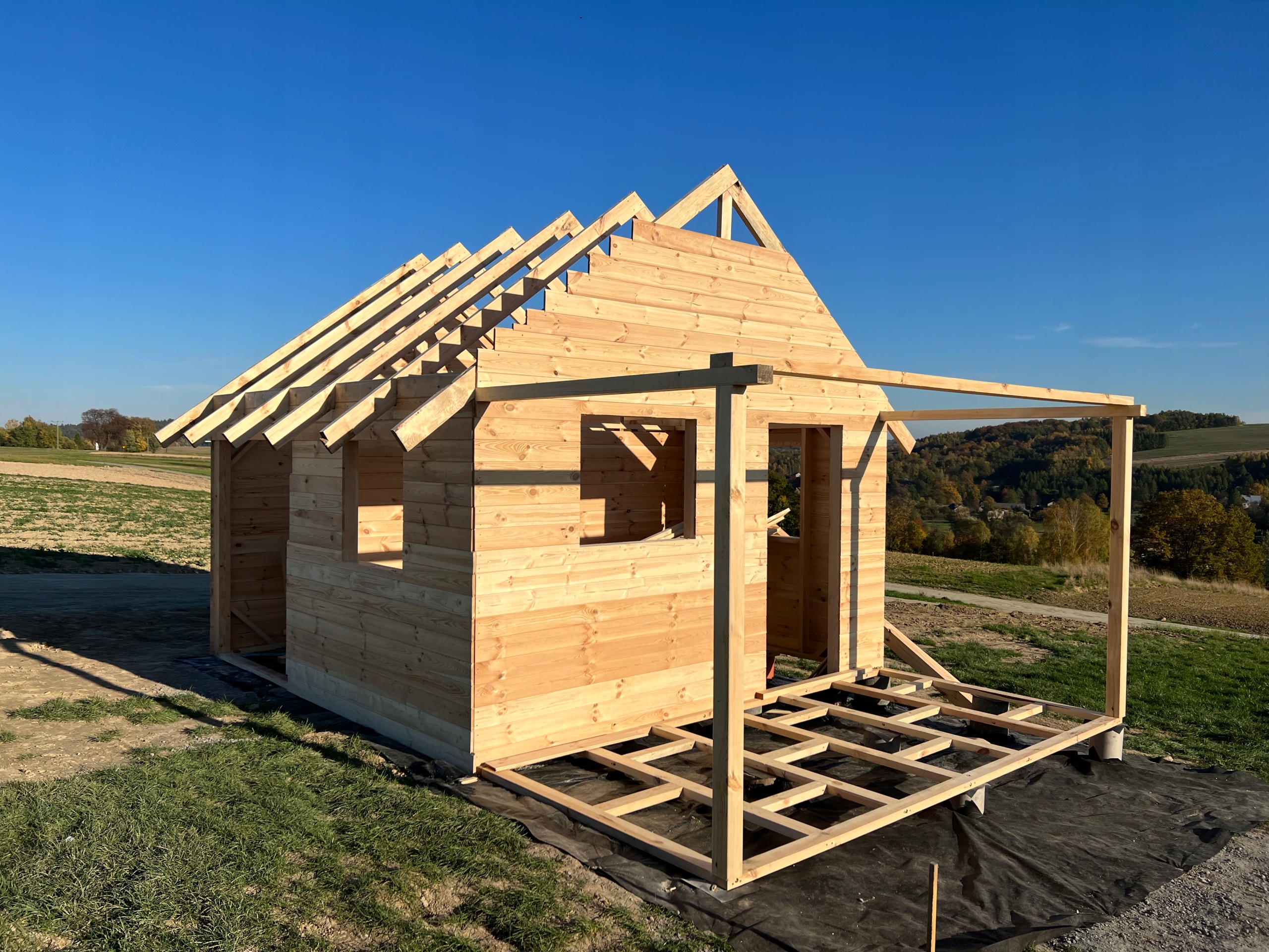 - Здание размерами 400х400 см, выполненное из дерева в каркасной системе, покрытое фасадные доски и стропильная конструкция крыши li>