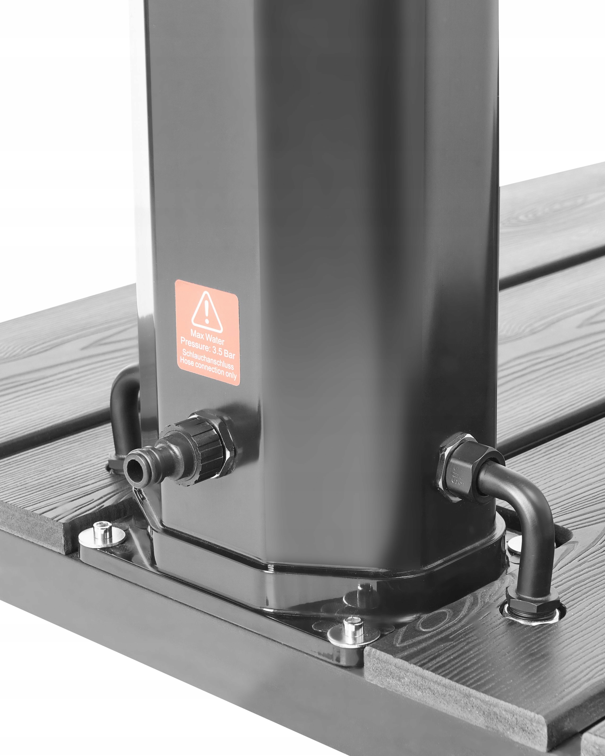 Любые соединения должны выполняться в соответствии с инструкциями и стандартами, принятыми в данной стране. Внешний душ должен быть установлен с использованием 4 прикрепленных прикрепленных винтов на твердой и плоской поверхности (например, цемент, плитки) с доступом к водной системе. Чтобы предотвратить повреждение зимой, душ должен быть демонтирован и опустошен, а затем хранить его в сухой комнате. Пренебрежение этим может вызвать утечку душа и воды.