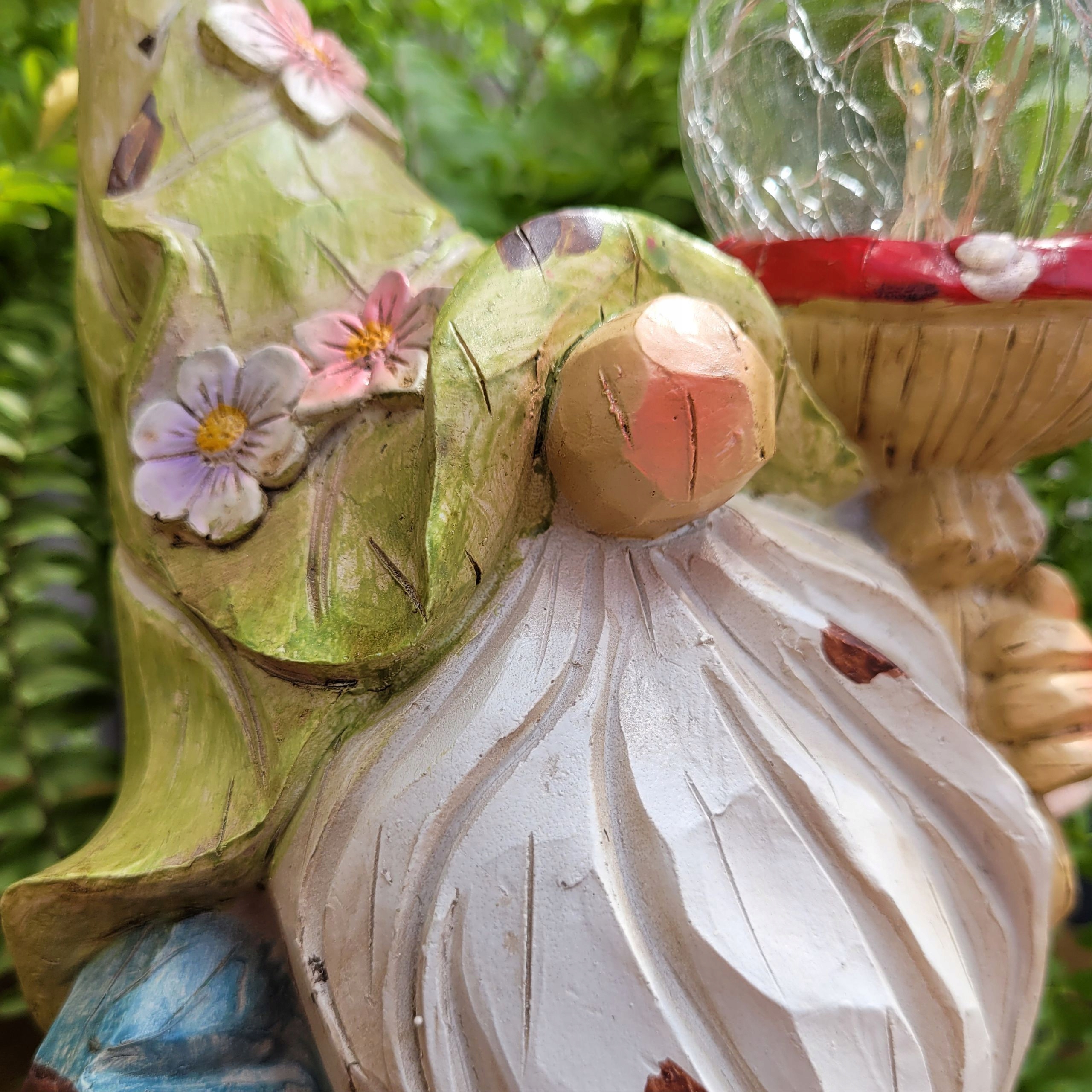 Эта очаровательная фигурка гнома держит в руке поганку с овальным куполом с подсветкой. Ручная роспись с прекрасными деталями. Настоящее произведение искусства станет очаровательным украшением любого дома или сада.