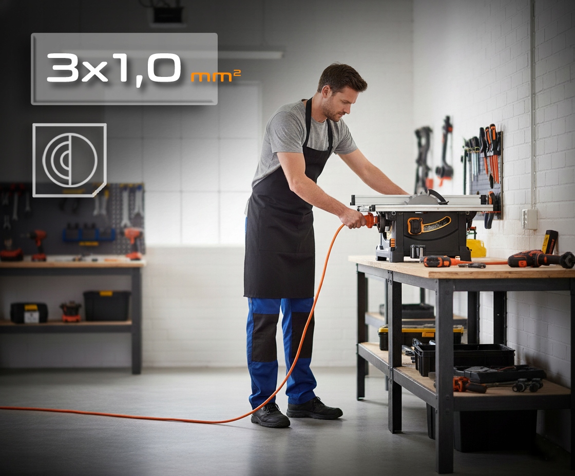 Самым главным преимуществом данного удлинителя является дополнительный защитный кабель, что значительно повышает уровень безопасности. Благодаря такому решению риск поражения электрическим током сведен к минимуму. Это особенно важно при работе в саду, гараже или мастерской, где легко случайно попасть под влагу или металлические элементы.