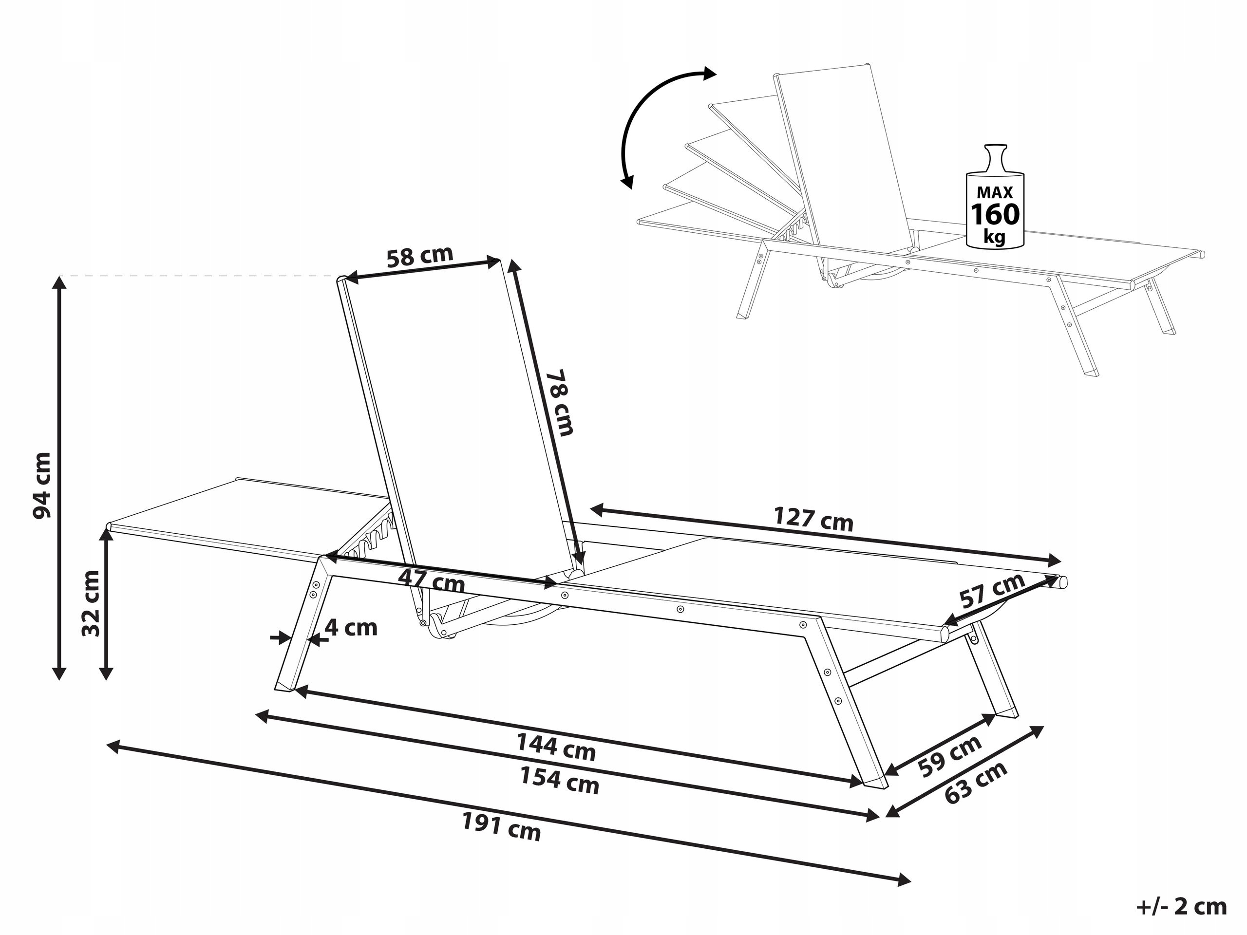 Наслаждайтесь прекрасной погодой и солнцем, лежа на этом садовом шезлонге. Изделие изготовлено из стали и текстильных волокон, что делает его чрезвычайно прочным и простым в уходе. Шезлонг также устойчив к ультрафиолетовому излучению, поэтому вам не придется беспокоиться, что прекрасная погода повредит его. Преимуществом шезлонга является регулируемая спинка, благодаря которой можно быстро перейти из сидячего положения в лежачее.