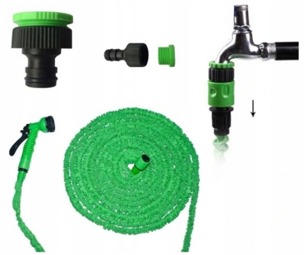 УДЛИНИТЕЛЬНЫЙ ШЛАНГ — внешняя часть шланга и двойной слой латекса — растягивающийся внутренний шланг. Благодаря этому он устойчив к высокому давлению и не гнется. Он очень легкий по сравнению с традиционными шлангами. Его длина составляет от 10 метров в состоянии покоя до 30 метров в состоянии слива воды. Занимает очень мало места.