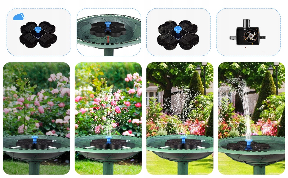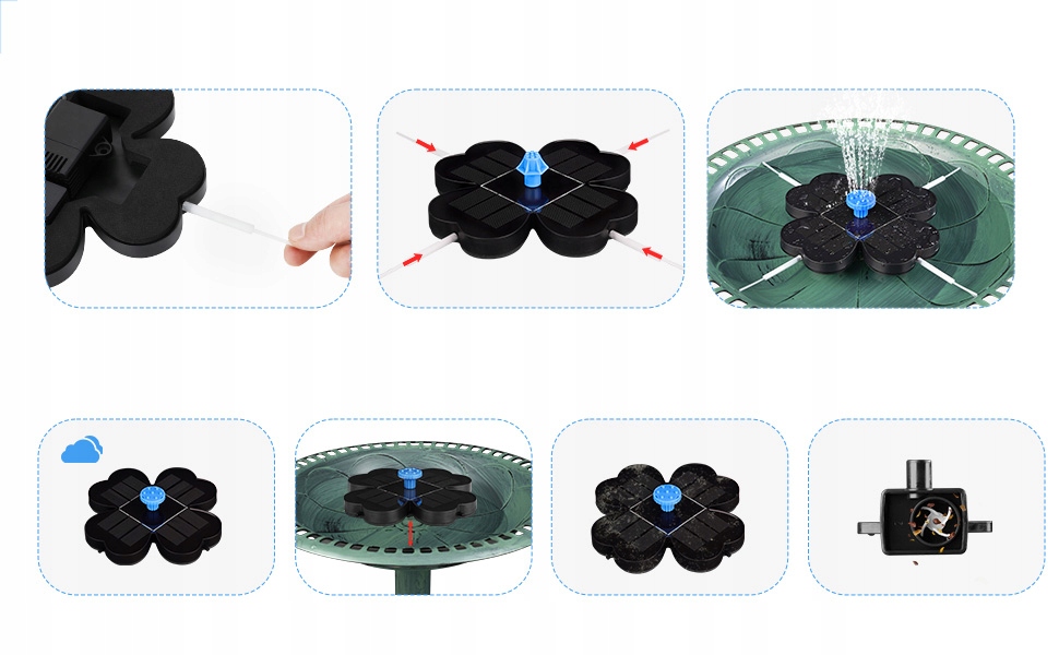 - солнечный насос 3,5 Вт очень эффективен, большая солнечная панель обеспечивает высокую мощность, уровень воды зависит от интенсивности солнечного света. (Примечание: он работает только при прямом солнечном свете, он может не работать в облачные дни и ночи.)