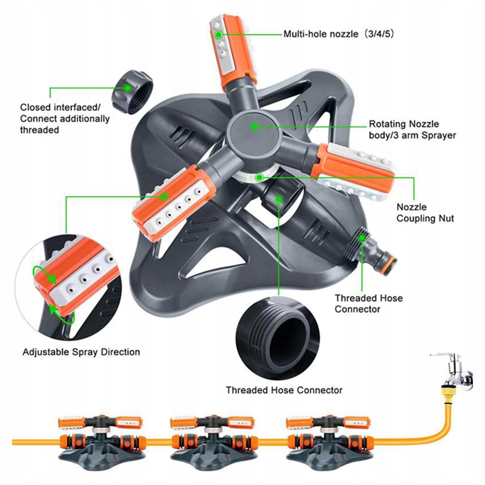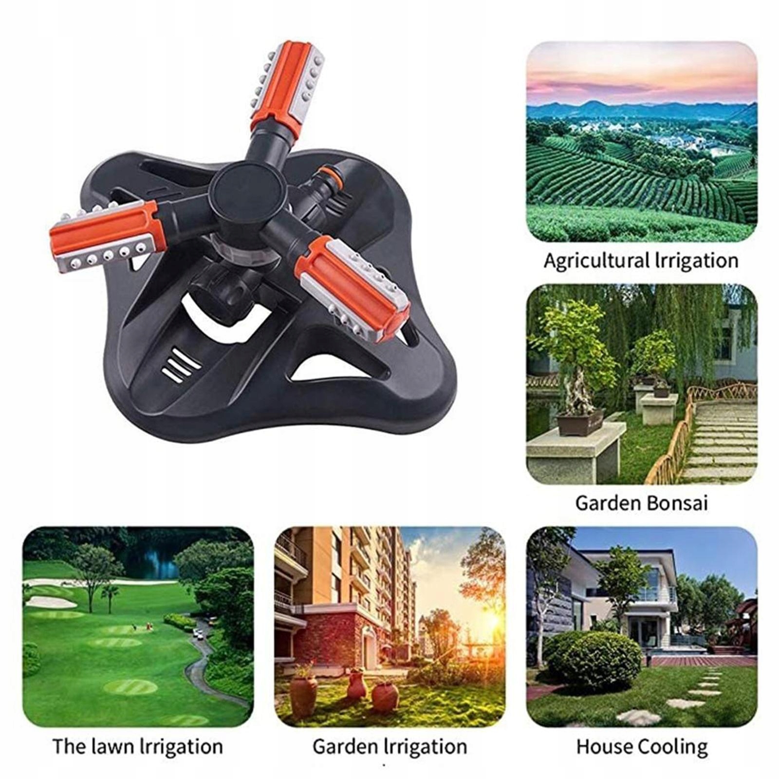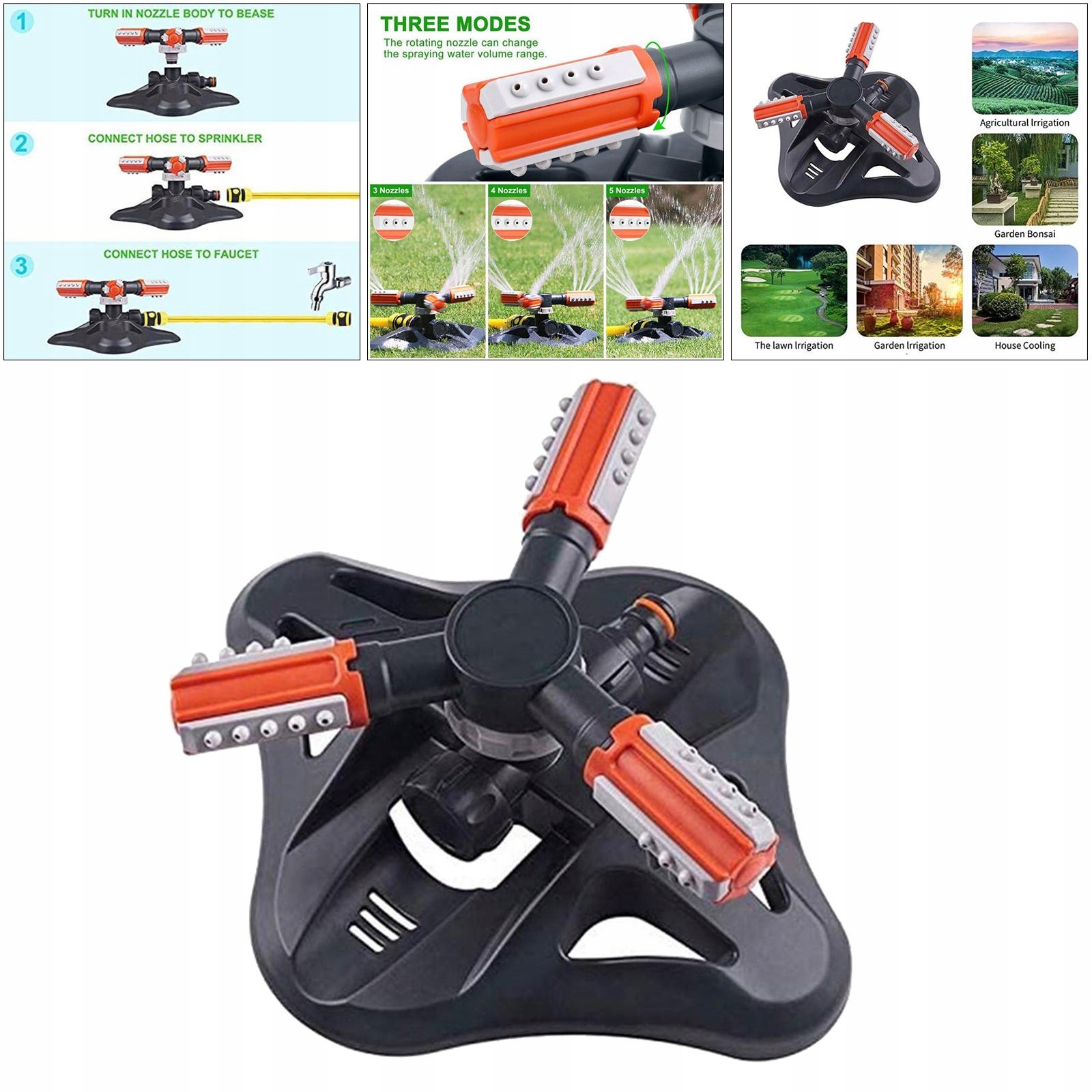 Нет необходимости подключаться к мощности или другим шлангам, который будет подключен, и вода будет включать, и садовый разбрызгиватель автоматически вращается и распыляет воду равномерным образом