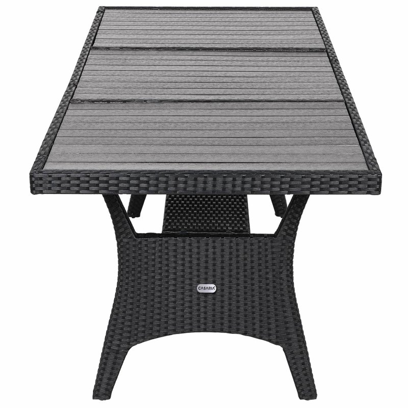 Эксклюзивный садовый стол из полиротанга размером 190 x 90 x 75 см оснащен очень прочной столешницей из ДПК, имитирующей дерево. Благодаря этому стол хорошо защищен от ветра и погодных условий и идеально подходит для сада, террасы или дома. Каркас стола изготовлен из прочной стали с порошковым покрытием и выдерживает большие нагрузки. Ножки стола индивидуально регулируются с помощью регулировочных винтов, что делает стол устойчивым даже в случае неровностей. Полиротанг был разработан специально для садовой мебели. Он устойчив к загрязнениям и легко чистится.