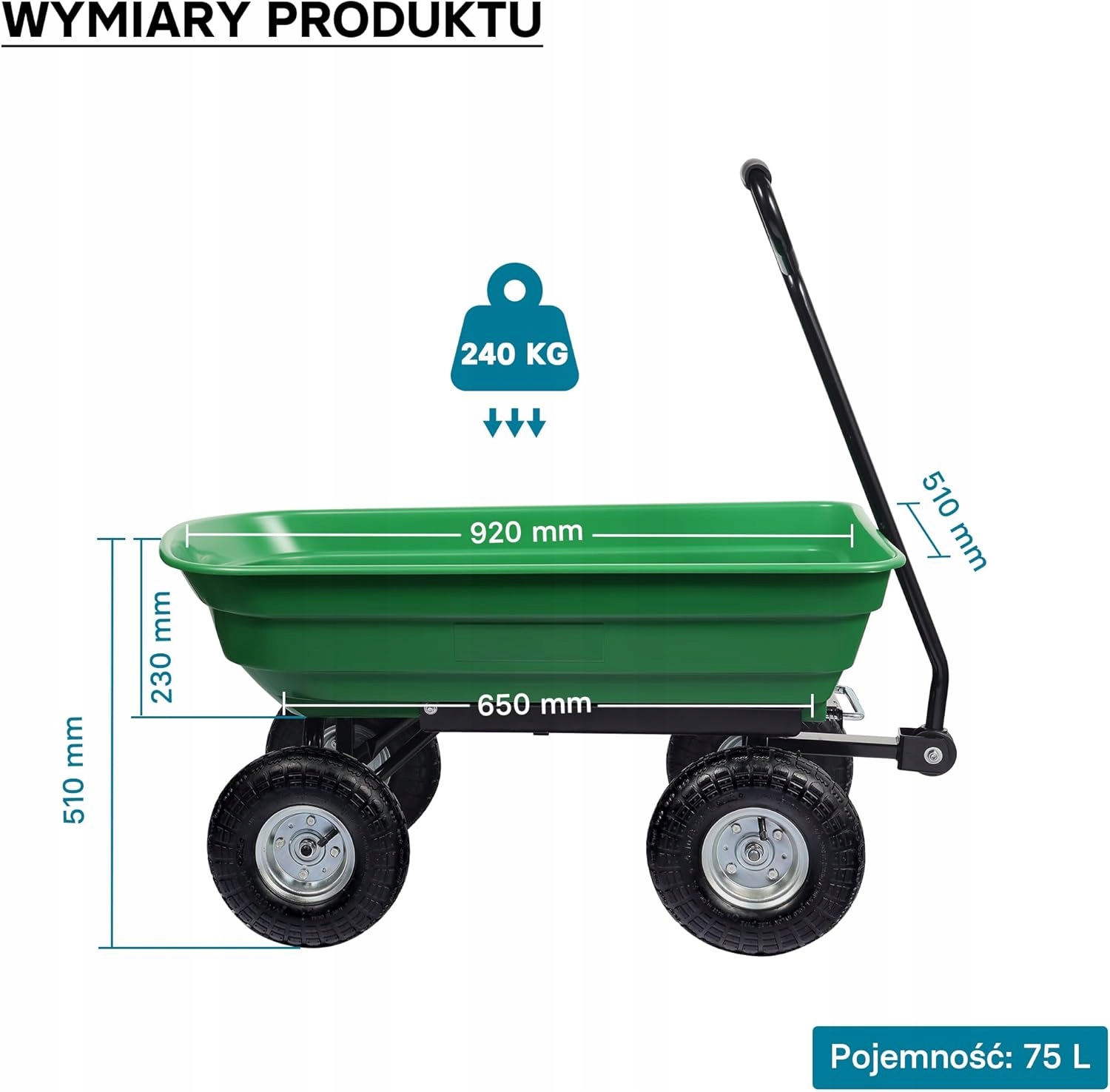 Прочная конструкция – Тележка грузоподъемностью 240 кг является надежным инструментом для перевозки тяжелых материалов. Металлический каркас обеспечивает устойчивость, а пластиковая ванна емкостью 75 литров устойчива к влаге и повреждениям. Благодаря прочной конструкции он пригоден для интенсивного использования в течение многих сезонов. 💪🛠️