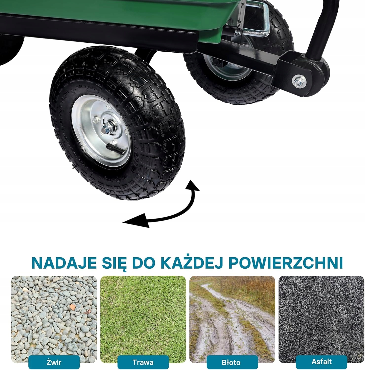 Легкость маневрирования – Поворотная передняя ось и большие пневматические шины позволяют коляске плавно передвигаться по различным поверхностям, таким как трава, гравий, грязь и асфальт. Устойчивая конструкция обеспечивает точный поворот даже при полной загрузке, что делает его чрезвычайно функциональным в любых условиях местности. 🌿🚜