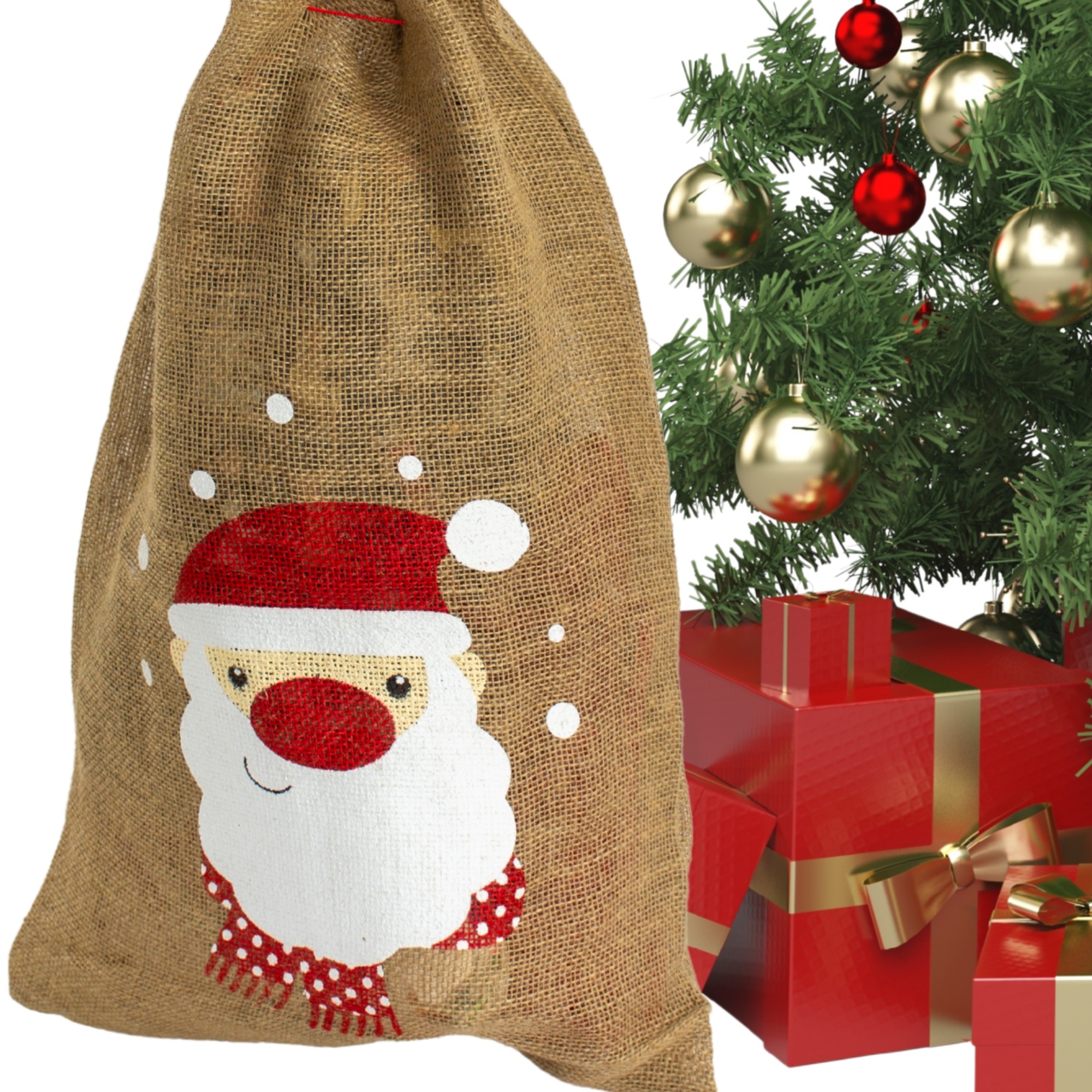 мешок для джутовых подарков 70x50см Санта не только выглядит великолепно, но и долговечен и экологию. Вы можете использовать его, чтобы упаковать большие подарки, украсить рождественские аранжировки или хранить подарки под елку - и после Рождества в следующем году.
