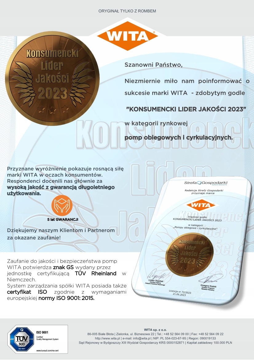 - Компания WITA была удостоена Лавры потребителя 2023 в категории циркуляционных насосов.