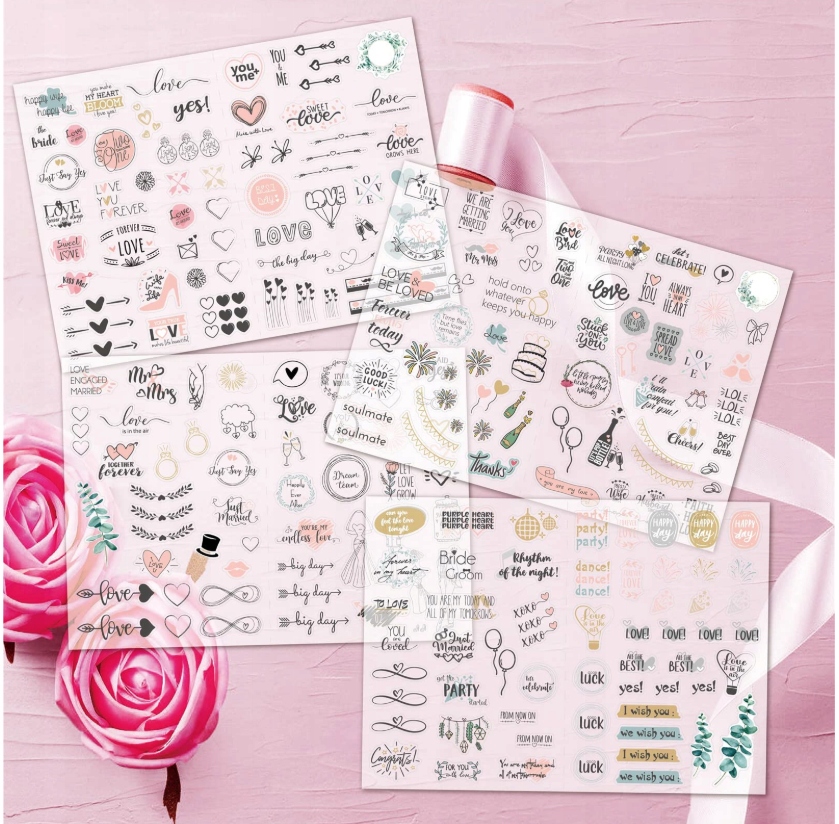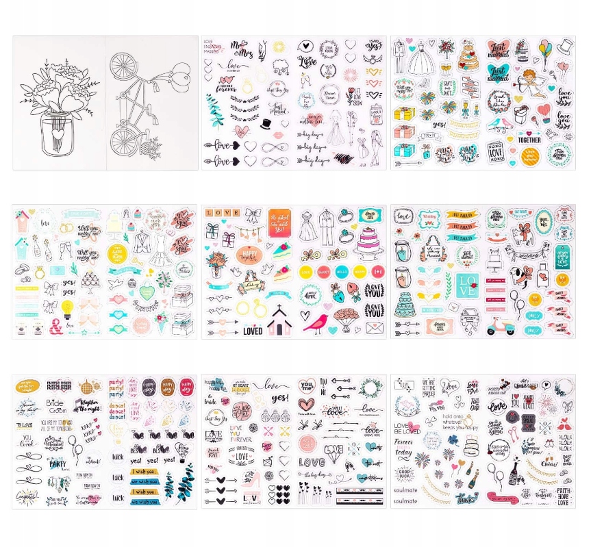 Сведения о пакете : 9 Свадебные наклейки для скрапбукинга В общей сложности, в двух наклейках на наклейках есть 436 наклейки, все на английском языке.