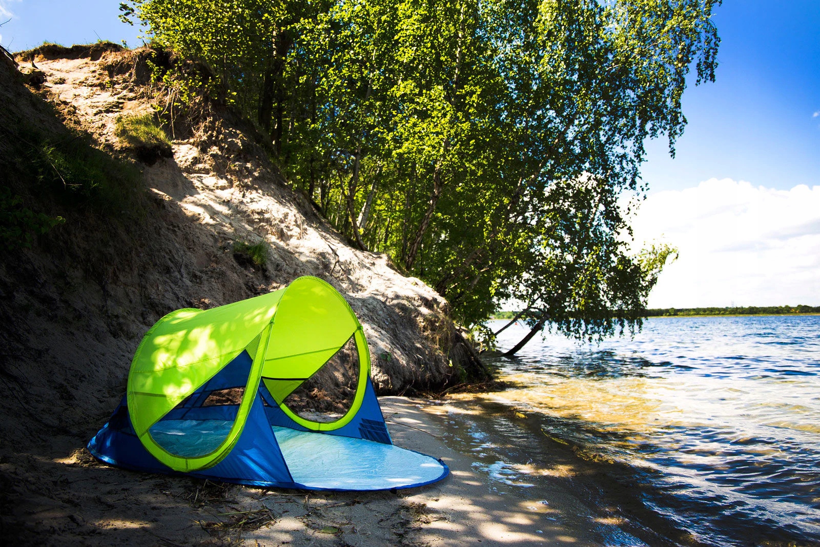 Палатка изготовлена из прочных технических материалов, которые защитят вас солнечным светом, в то время как стабильная структура является прочной и гибкой стеклянным волокном. Сетчатые вставки были размещены по бокам, которые обеспечивают высокую вентиляцию в середине. 2 Внутренние карманы подойдут к телефону, книге или читателю, а в целом он настолько легкий и имеет возможность сложить к сумке, что вы можете легко вписать его в багажник.