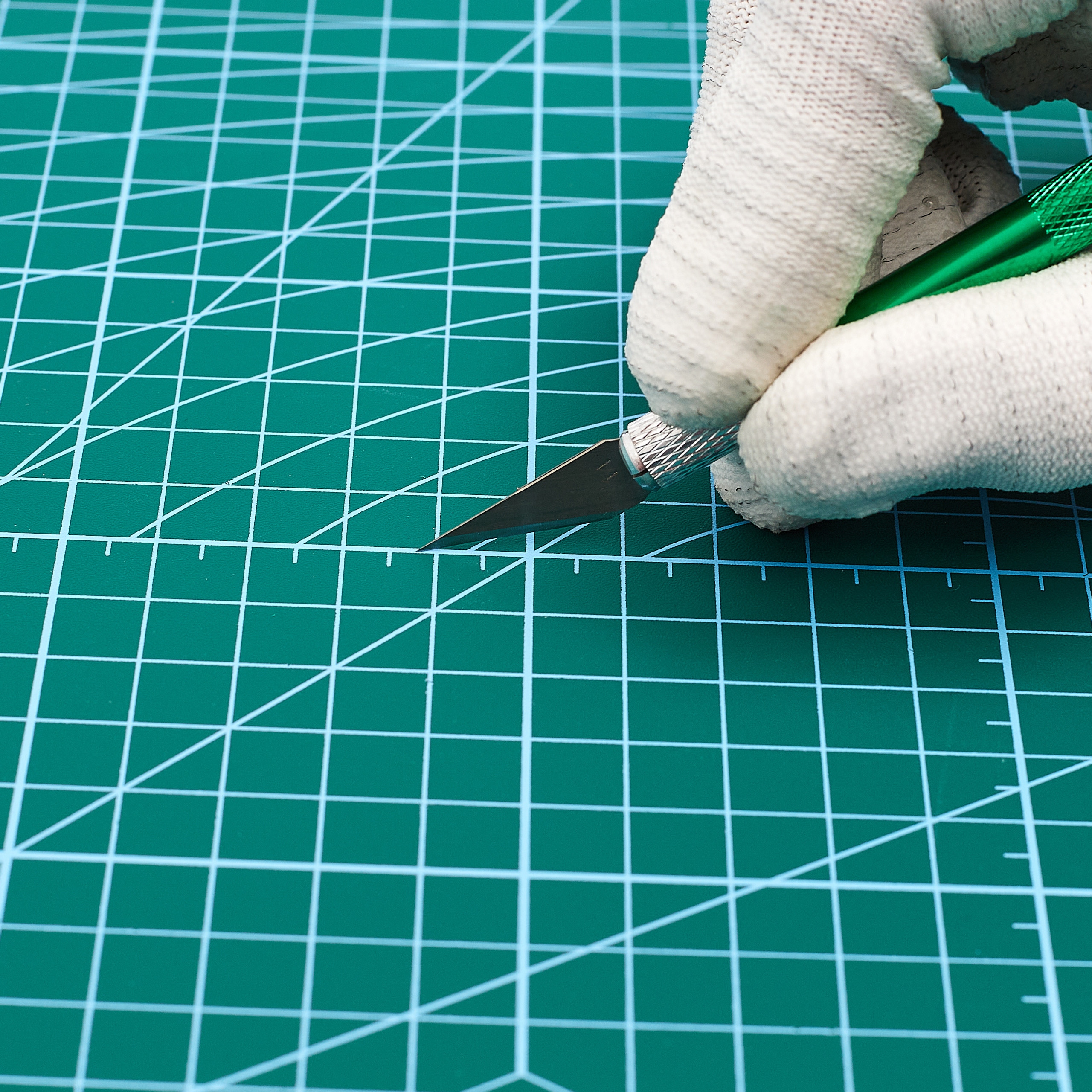 Коврик изготовлен из специального материала, обладающего самовосстанавливающимися свойствами – он частично регенерирует после разрезания лезвием. После резки коврик остается гладким. Коврик двусторонний - на нем напечатана шкала, вспомогательные линии и фигуры, полезные в работе, каждая сторона имеет свой принт. Коврик идеально подходит в качестве подкладки под рабочий стол или письменный стол, его можно использовать во время моделирования или работы в офисе. Коврик можно разрезать скальпелем, дисковым ножом или сегментным ножом.