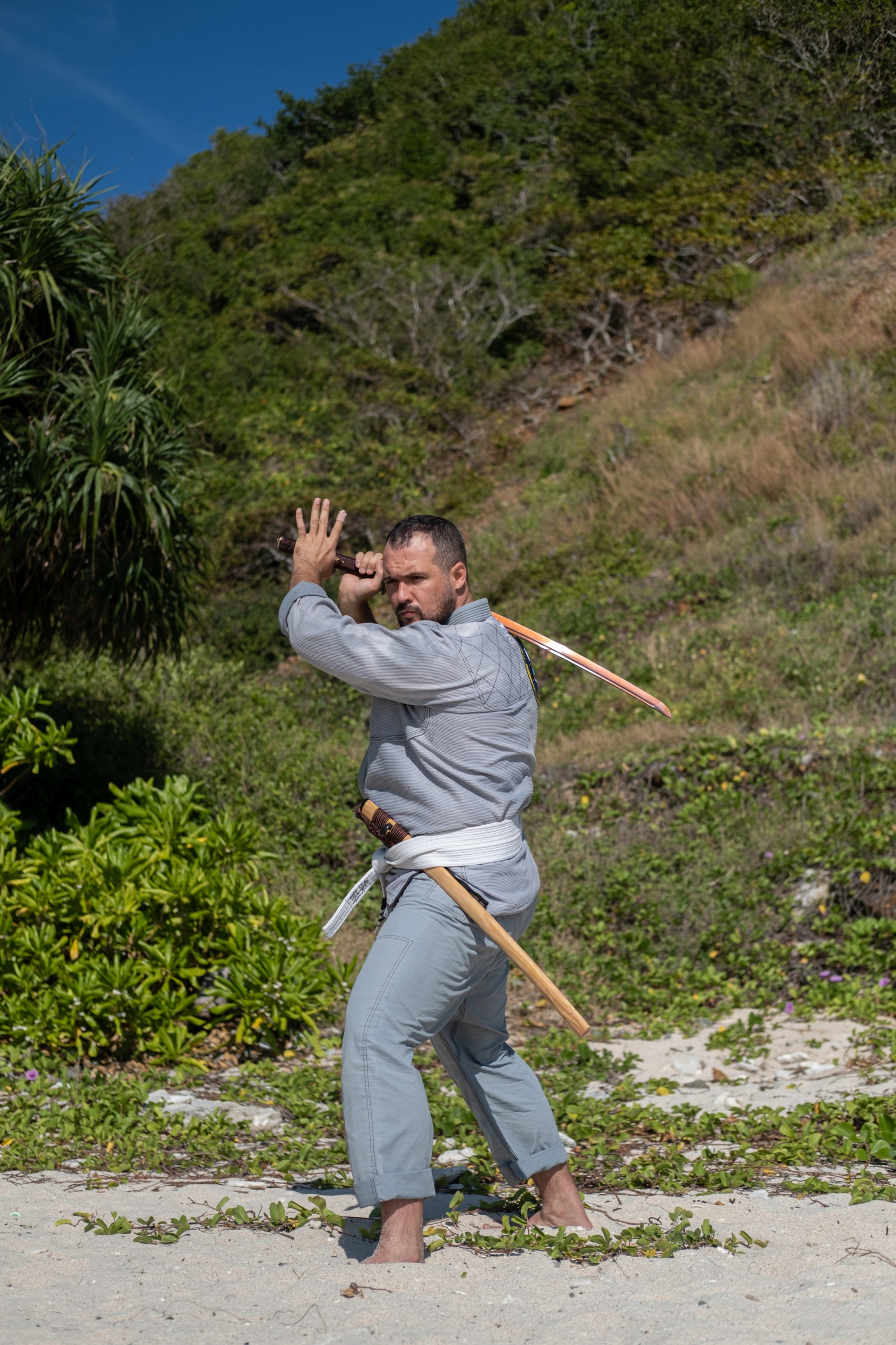 В комплект входят ножны сая, завязанные на шее койгути, и шнур сагео, проходящий через кури-ката.