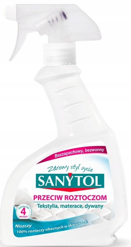 *Санитол против клещей эффективно удаляет пылевых клещей (акарицид) и клопов (инсектицид). ) в течение нескольких минут. Убивает 100% клещей и клопов через 24 часа. Продукт по-прежнему эффективен против клещей домашней пыли в течение 4 месяцев после применения и до 3 месяцев в отношении клопов. Максимальная частота использования: 4 применения/год.