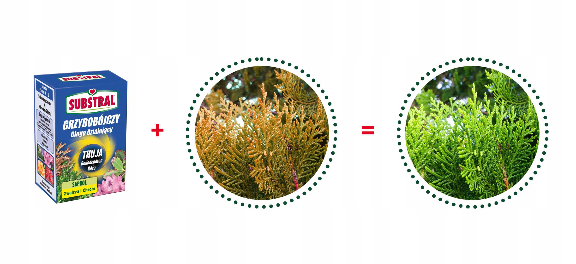 САПРОЛ это профессиональный препарат, который ограничивает побурение туи, вызванное отмирание чешуек и побегов. Это современный препарат, проникающий вглубь растения и циркулирующий с его соками в течение не менее 3 недель. Как обычно, гораздо эффективнее профилактические обработки, особенно в новых посадках. Судя по всему, этот системный препарат предназначен именно для такого типа применения, т.е. для обеспечения долговременной защиты, когда растение, пересаженное в новую среду, наиболее ослаблено и восприимчиво к заболеваниям.