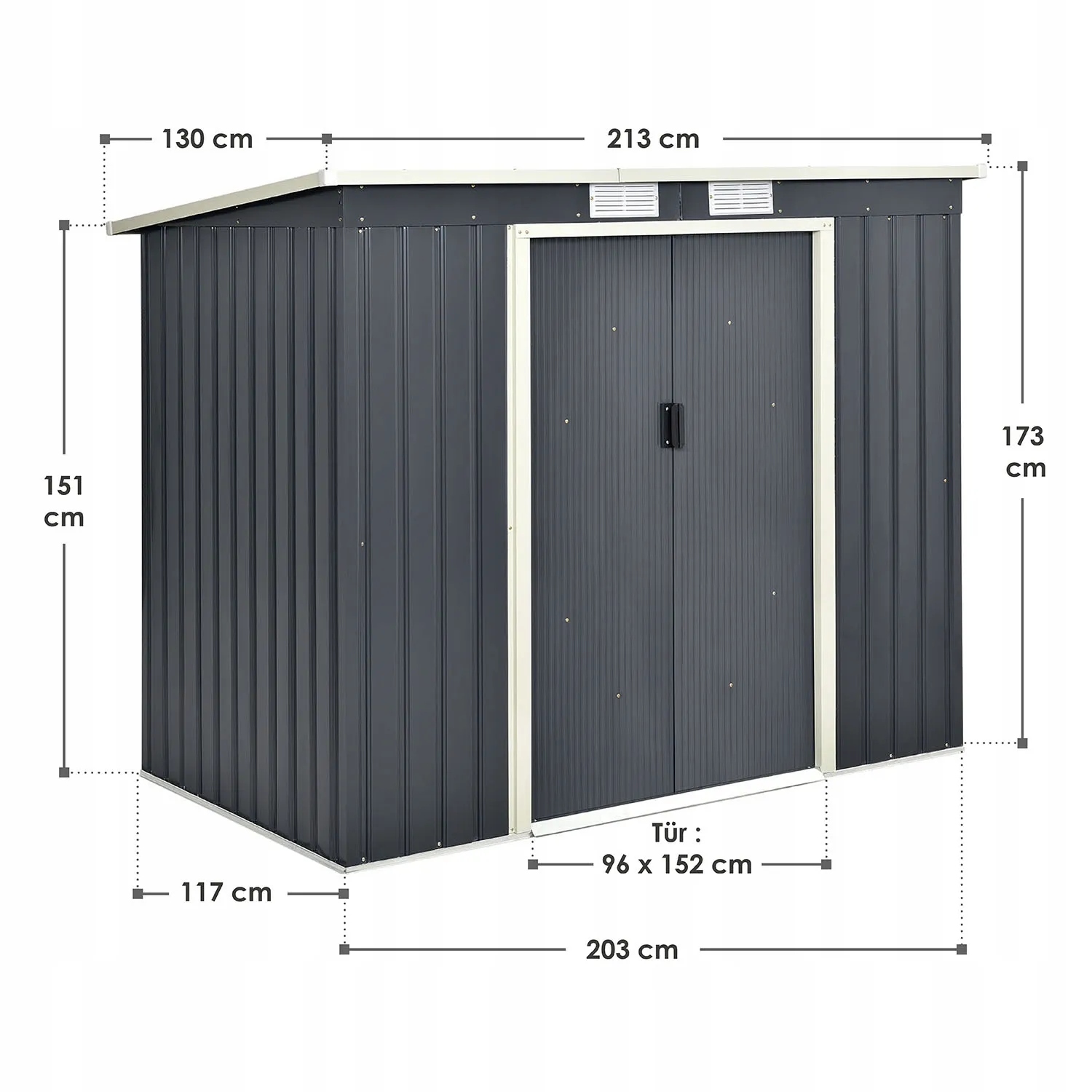 В практичном металлическом садовом домике объемом 4 м³ можно безопасно разместить садовую мебель и инвентарь. Садовая мебель, газонокосилки, контейнеры для мусора и автомобильные шины найдут свое место на поверхности 203×117 см. Кроме того, сарай для инструментов идеально подходит в качестве гаража для велосипедов.