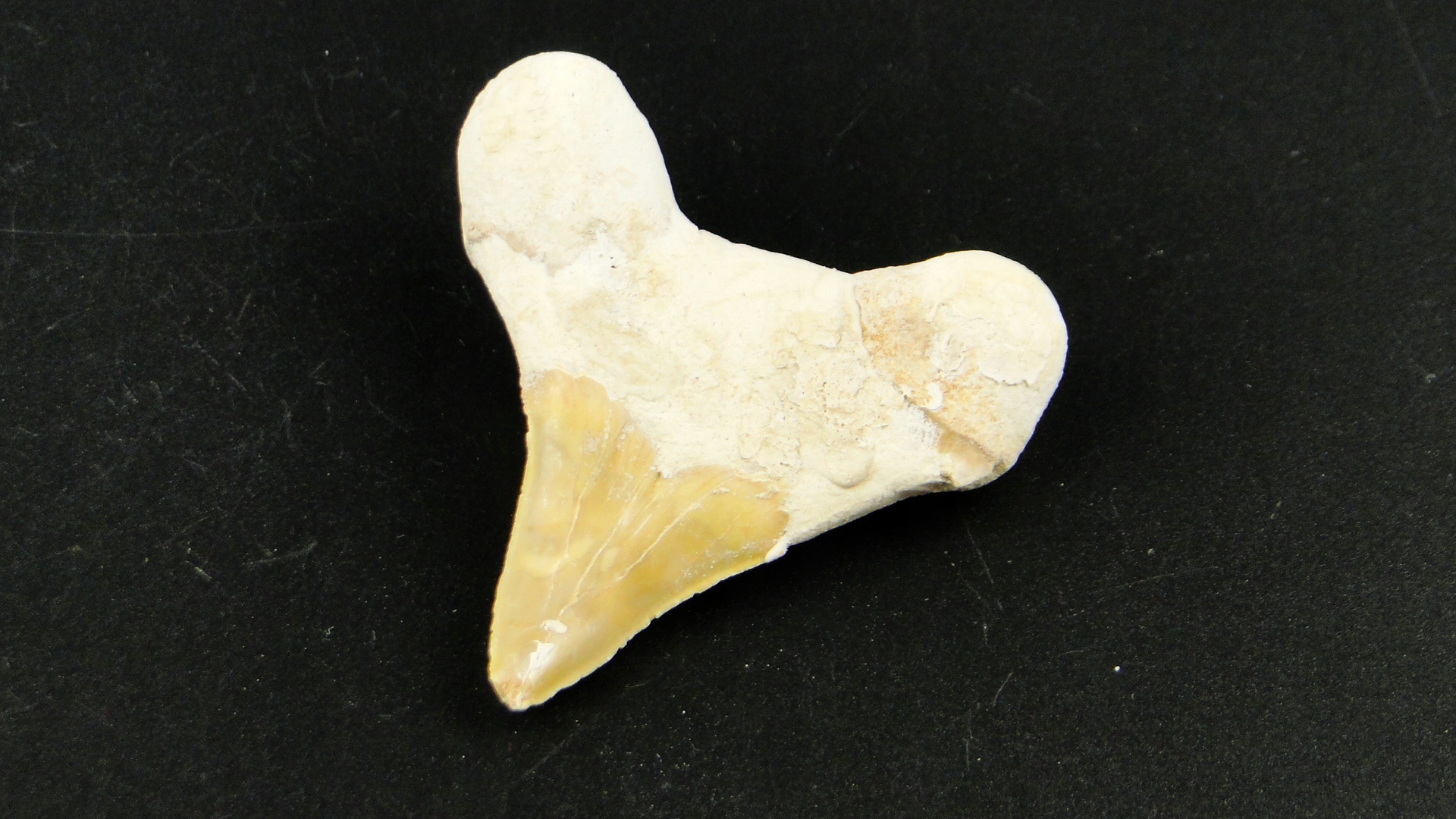 DХорошо сохранившийся окаменелый зуб акулы вида: Otodus obliquus, возраст зуба примерно 50-60 миллионов лет.