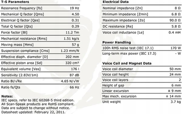 26W/8867T00 по сравнению с 26W/8861T00 имеет аналогичные значения fs, немного меньшие Qts и значительно меньший Vas (эквивалентный объем), что означает, что его можно использовать в корпусе меньшего размера, получая аналогичные характеристики; цена этому - на полтора децибела меньшая эффективность. Корпус фазоинвертора должен иметь объём 50-70 литров, закрытый 35-50 литров (Qtc в пределах 0,6 - 0,7). Катушка диаметром 50 мм, высотой 24 мм, расположенная в зазоре 6 мм, обеспечивает линейную работу в диапазоне +/-9 мм; вся вибрационная система имеет максимальную амплитуду +/- 14 мм. Корпус катушки изготовлен из титана, что в совокупности с размерами обеспечивает очень высокую термостойкость, поэтому среднеквадратическая мощность составляет целых 170 Вт. Основой таких возможностей является очень мощная вентилируемая магнитная система с СД-1. система, защищенная от повреждений резиновым чехлом. Прочная и продуманная корзина с аэродинамическим профилем обеспечивает свободный поток волн с задней части мембраны и из-под нижнего подвеса.