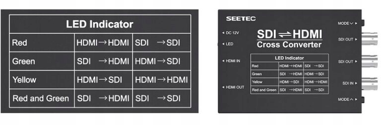 SCH SDI ⇌ HDMI Cross Converter имеет светодиодные индикаторы каждого режима работы устройства. Более того, на преобразователе имеется напечатанная схема переключения, которая поможет вам быстро настроить: вам нужно всего лишь нажать кнопку переключения режимов вверх/вниз, чтобы переключить цвет индикатора: