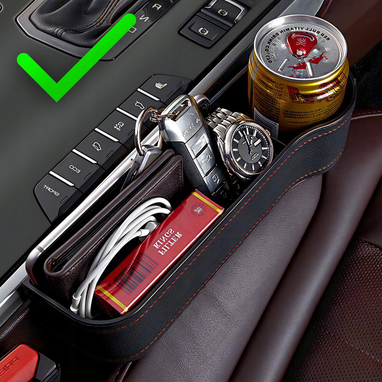 Собрать изделие действительно очень просто! Никаких дополнительных элементов крепления не нужно — просто вставьте более длинный элемент органайзера между сиденьем и панелью коробки передач. Просто отрегулируйте положение так, чтобы он не мешал при езде и всё!