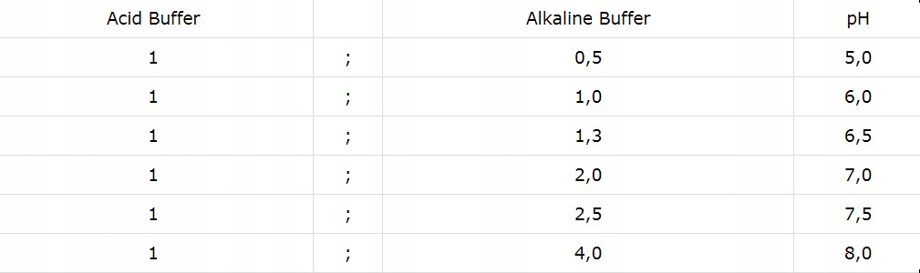 Советы. Щелочной буфер не снижает уровень pH, поэтому его можно добавлять непосредственно в аквариум в любое время суток. Он поддерживает pH 7,8, но в сочетании с кислотным буфером можно получить значения от 7,2 до 8,5. Сначала выберите количество «Щелочного буфера» для объема воды в зависимости от значения KH, которое вы хотите получить. Затем полученное количество делим на коэффициент из среднего столбца, получая таким образом необходимую массу "Кислотного буфера".