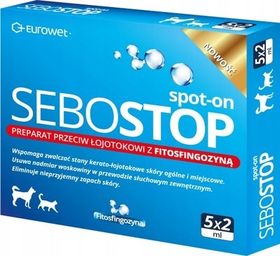 Себостоп спот-он – ветеринарный дермокосметический препарат, специально адаптированный для собак и кошек с симптомами себореи. Фитосфингозин способствует восстановлению рогового слоя, уменьшает себорею и регулирует микрофлору эпидермиса. Остальные ингредиенты препарата защищают кожу от обезвоживания и успокаивают ее раздражение.