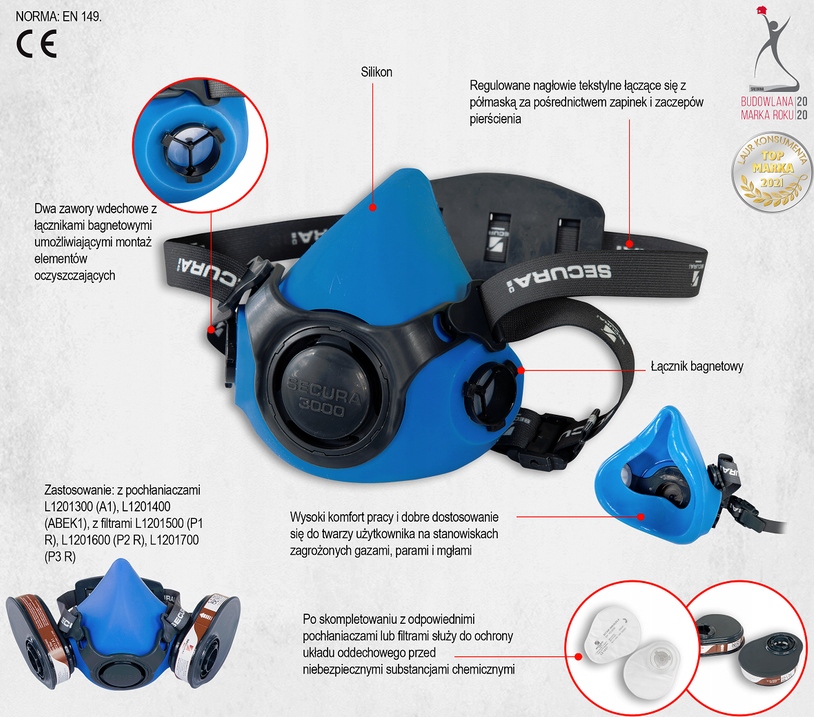 Полумаска SECURA 3000 имеет положительную оценку типа EC на соответствие Директиве 89/686/EEC и Постановлению министра экономики от 21 декабря 2005 г. (Законодательный вестник № 259, поз. 2173) согласно стандарт PN-EN 140:2001 разрешает маркировку продукта знаком CE.